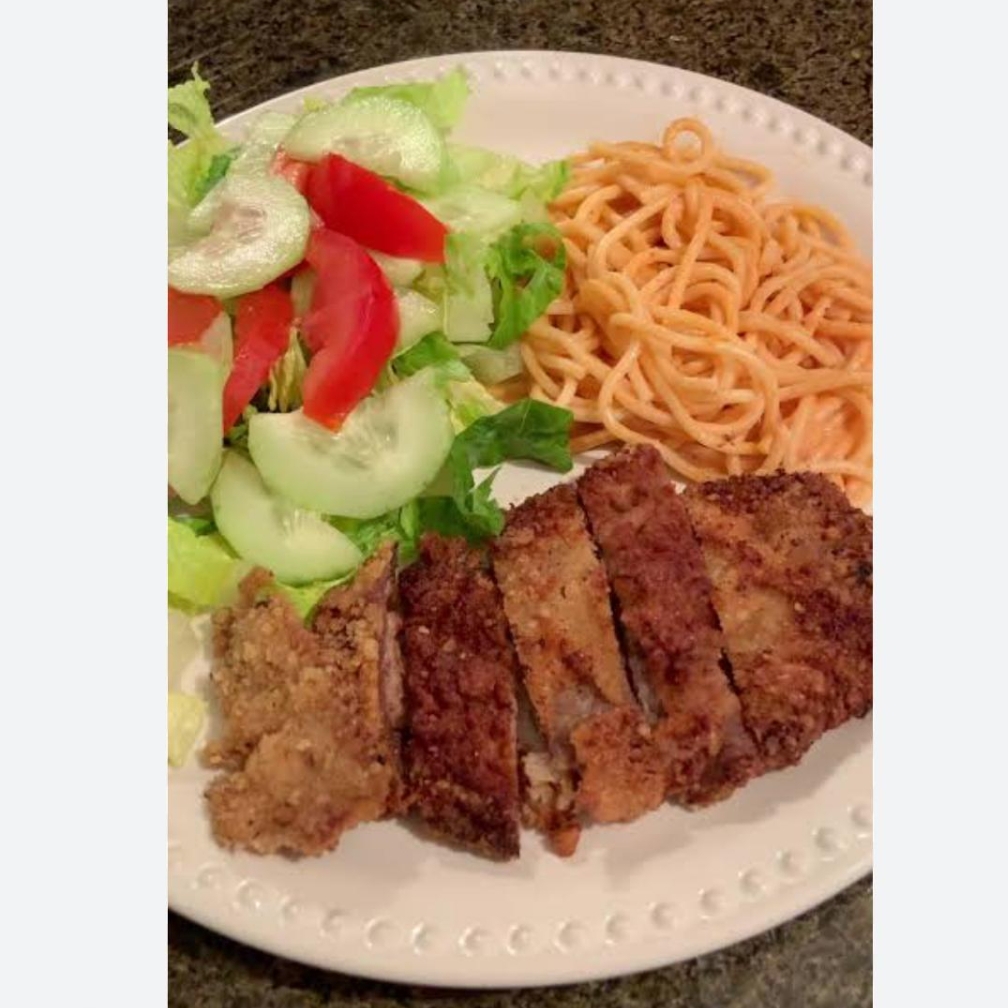 Milanesa pollo con ensalada,espagueti, agua de dia