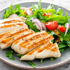 exquisita pechuga de pollo asada acompañada de arroz y agua del dia