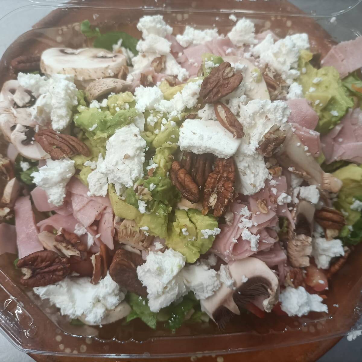 Ensalada grande de lechuga, jamón de pavo, queso doble crema, aguacate, champiñón crudo y nuez.