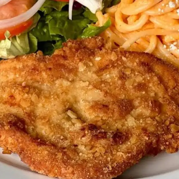 bistec de pechuga empanizada con pan granulado acompañada de ensalada, lechuga, jitomate aguacate pepino y zanahoria con una porcion de espagueti y agua chica del dia