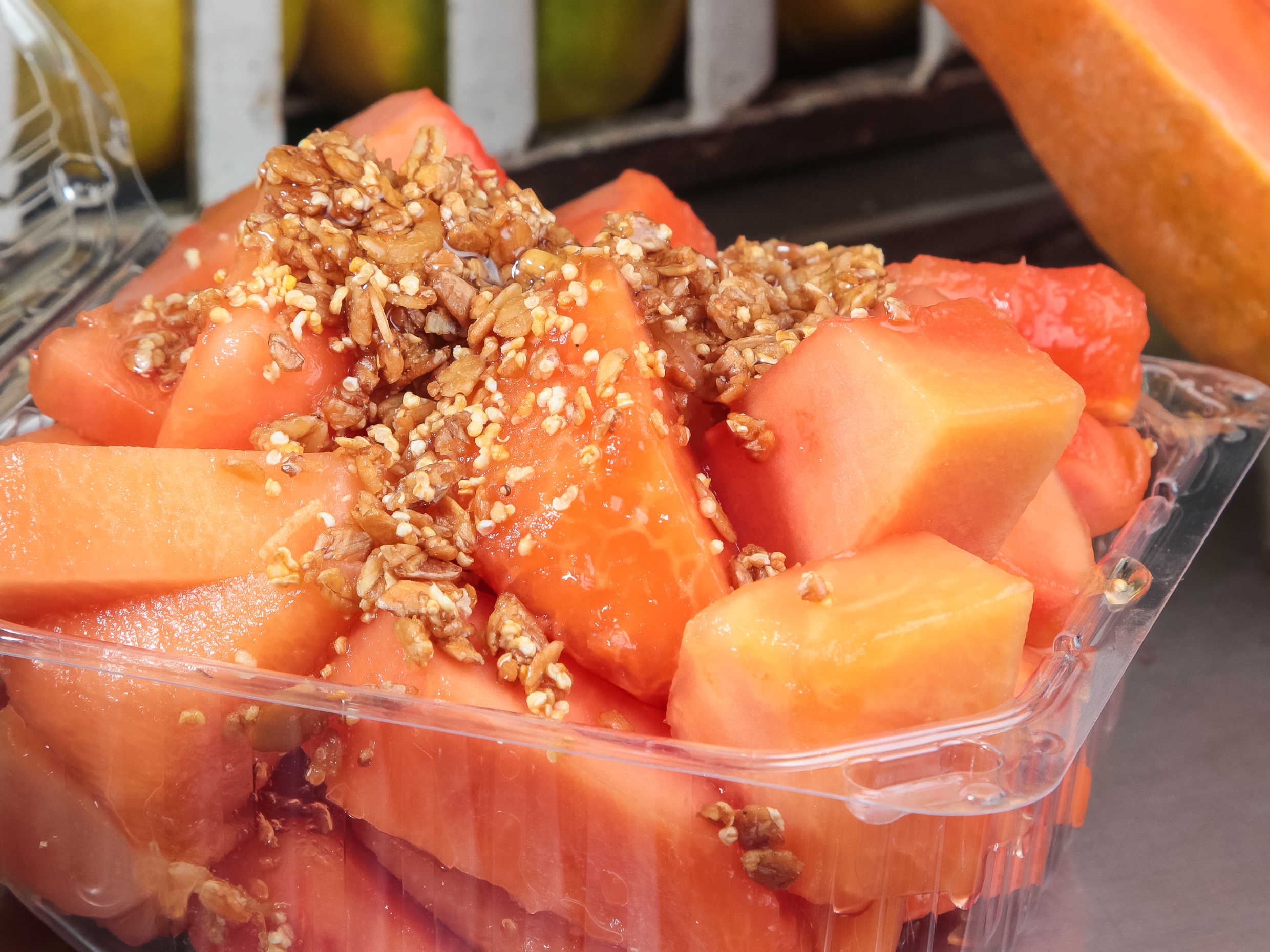 Preparado con sandía, piña, guayaba, naranja, manzana, fresa, plátano, melón, papaya, granola, avena, amaranto, salvado, coco y miel.