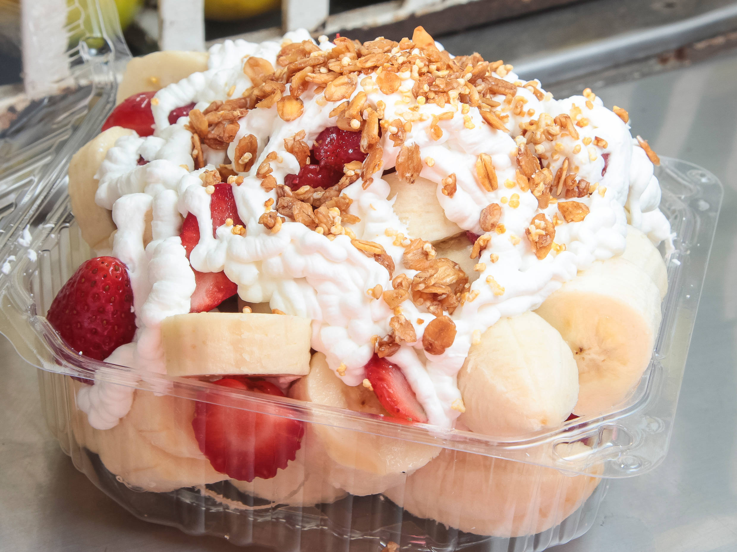 Preparado con fresa, plátano, mamey, guayaba, manzana, melón, papaya, granola, avena, amaranto, salvado, coco, chocolate, vainilla y canela.