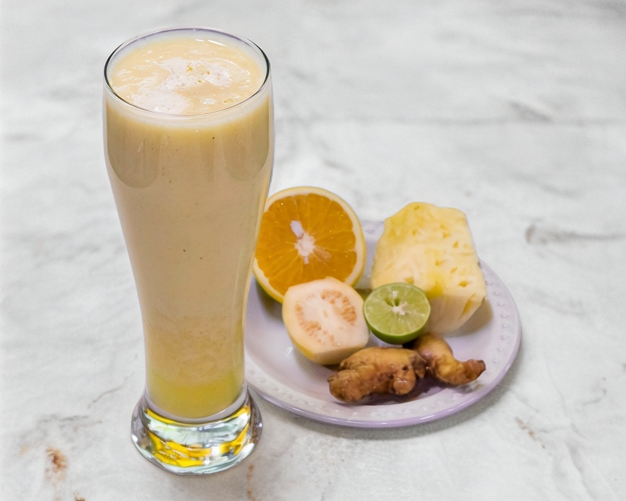Jugo de naranja con guayaba, apio y piña, tamaño de tu preferencia.