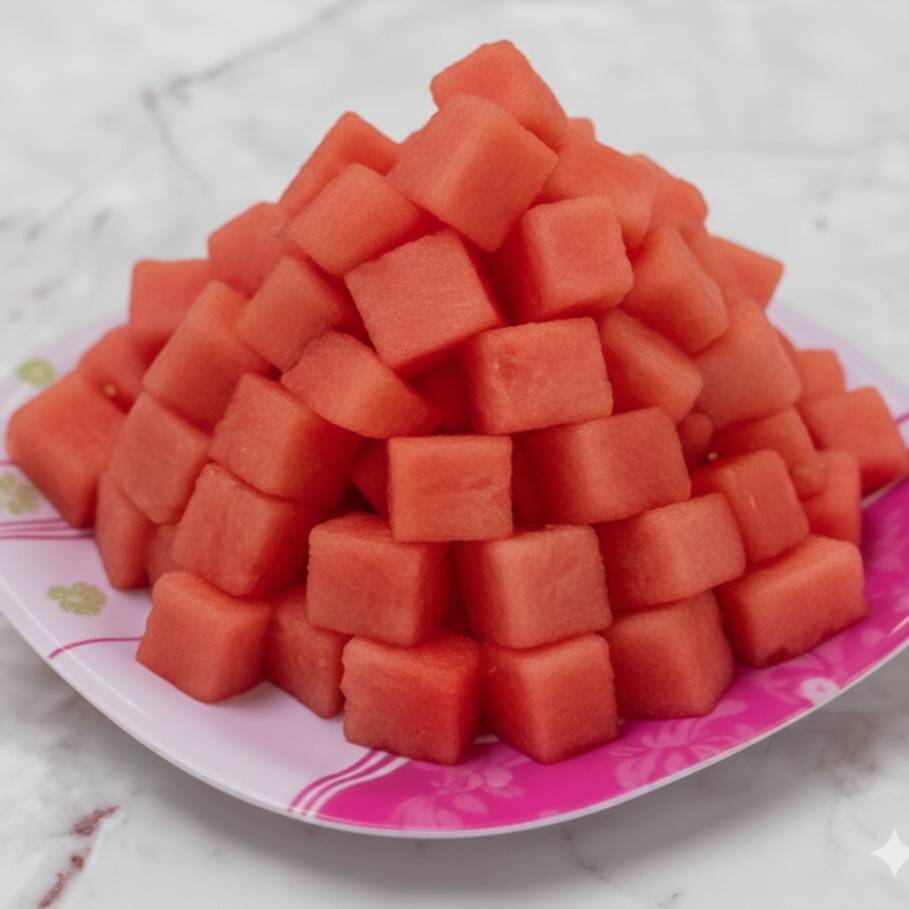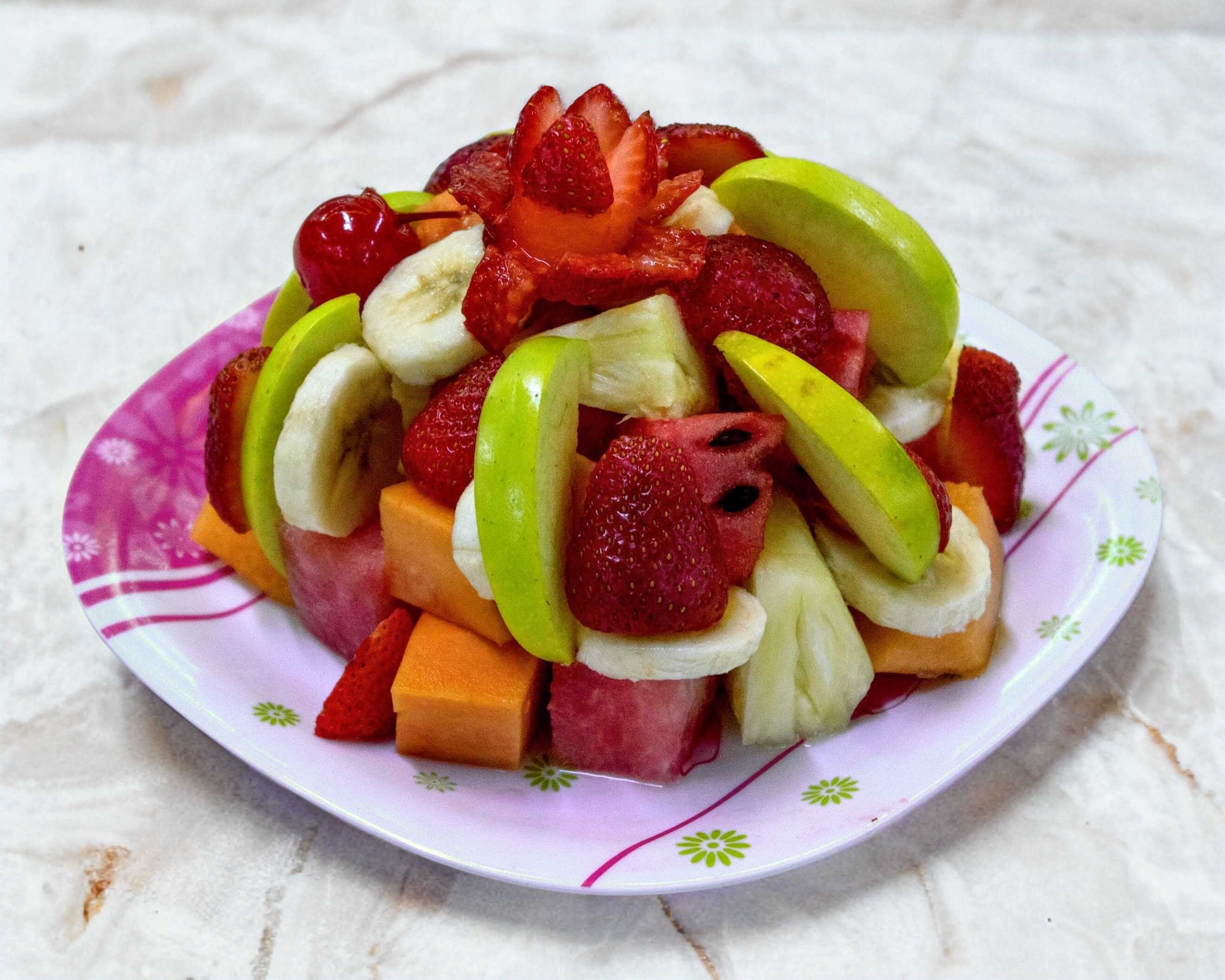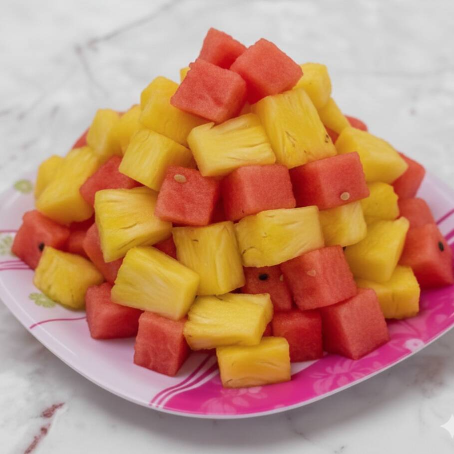 Fruta picada como papaya, guayaba, piña, sandía, melón, manzana, plátano, fresa y jugo de naranja.