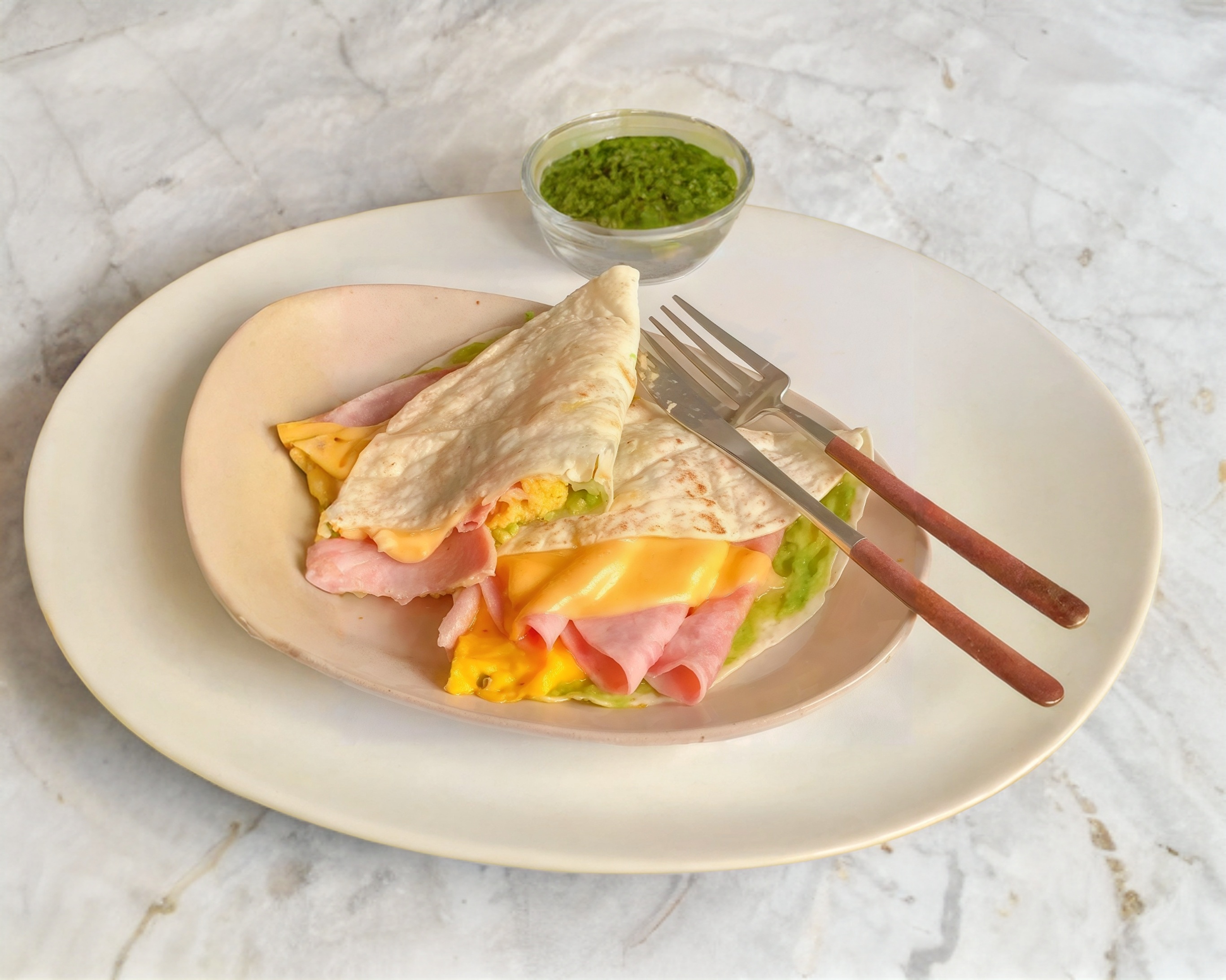 3 Piezas de tortilla de harina con jamón y queso manchego.