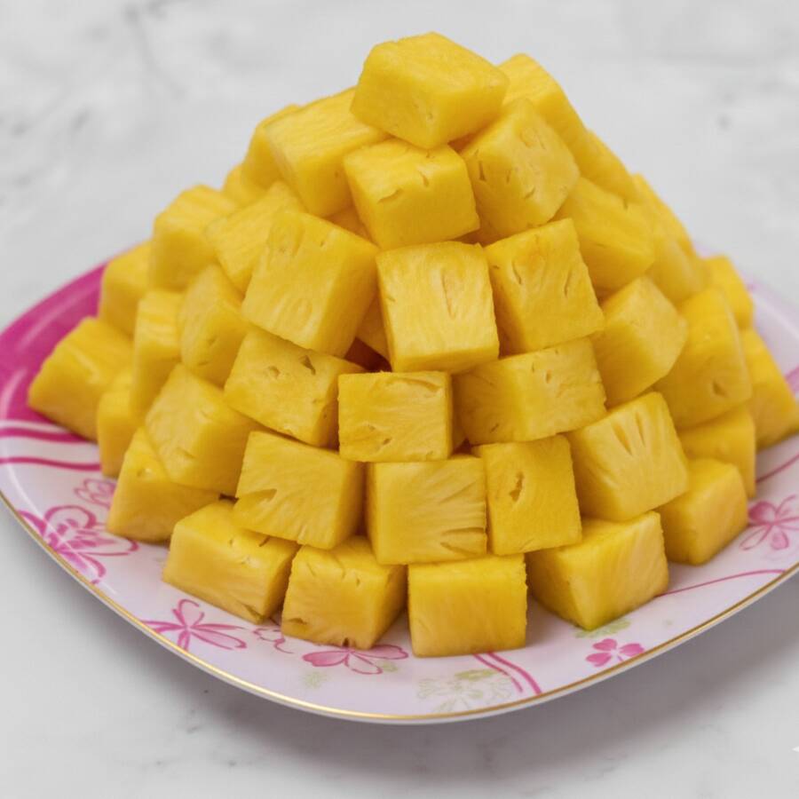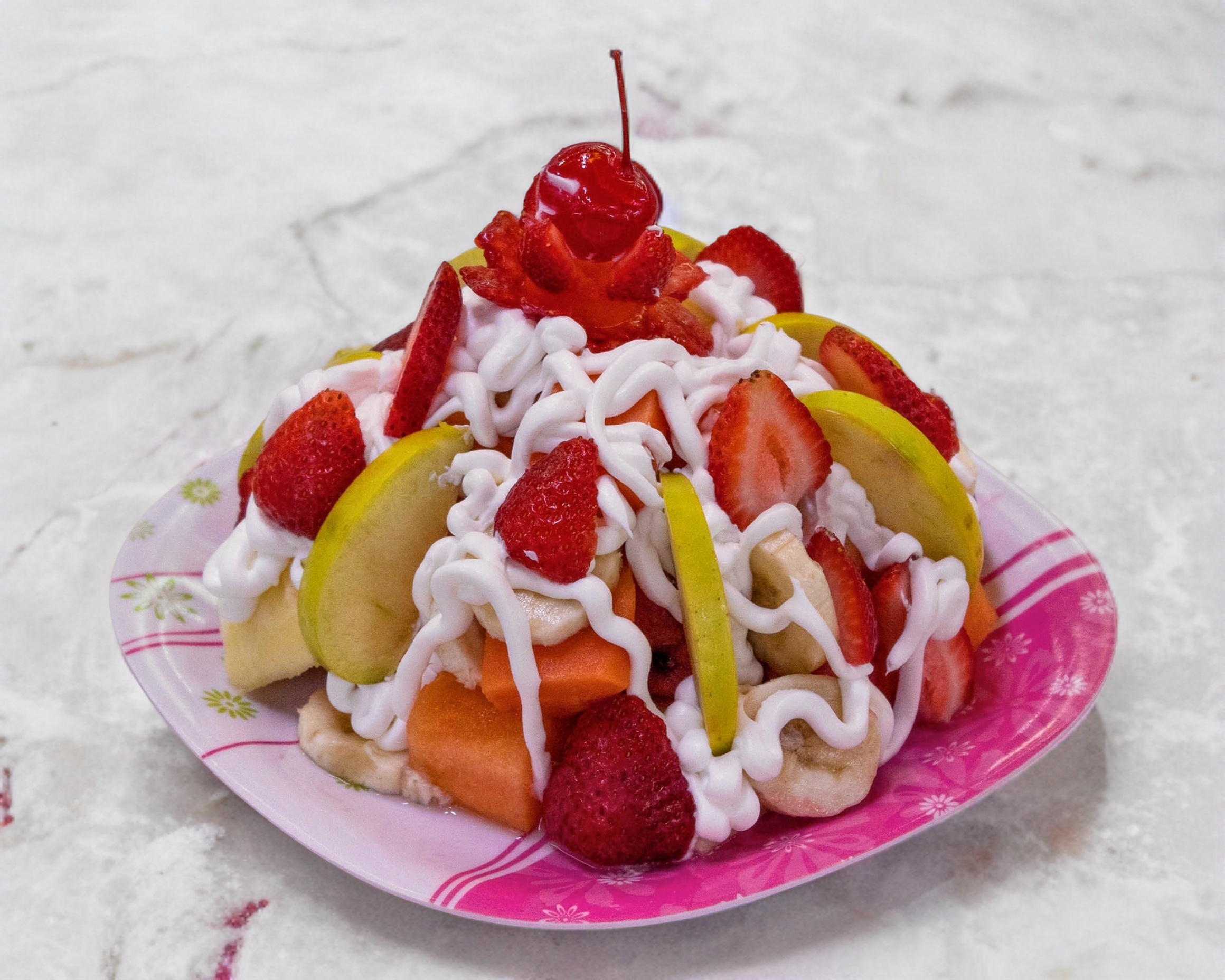 Plato personal chico, papaya, guayaba, piña, sandía, melón, manzana, plátano, fresa y mango, esto es según la temporada, además miel, granola, taper de plástico. Incluye topping de cereza.