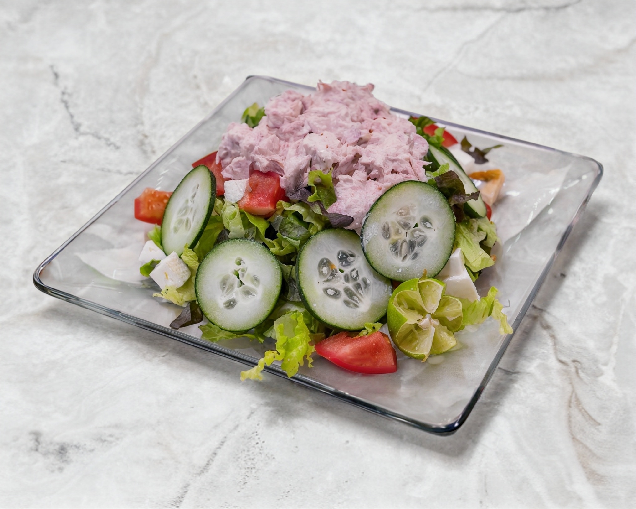 Atún, lechuga, cebolla, jitomate, aguacate, limón, sal, pepino, queso panela, ajonjolí y aderezo.