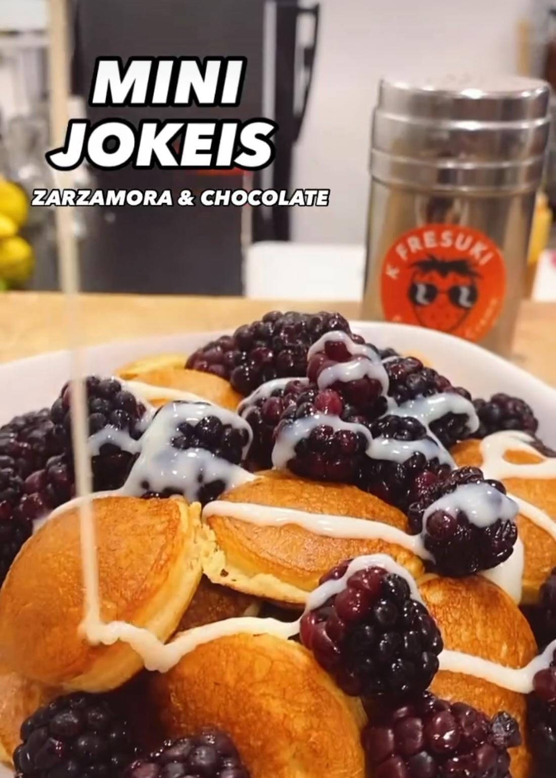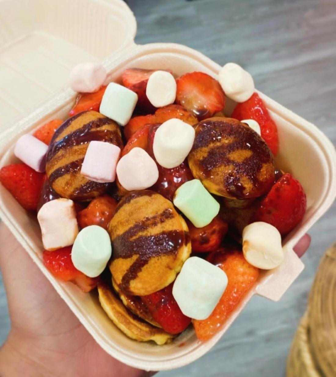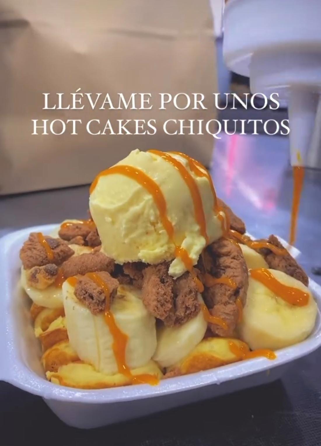 50 Mini hot cakes preparados al momento con fruta, líquido y topping a tu elección.