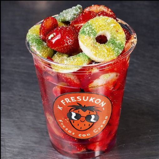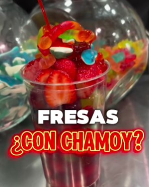 Fresas frescas picositas con chamoy, limón, chilito en polvo y gomitas a elegir.