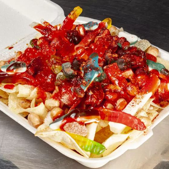 Crujientes hojuelas de papas fritas preparadas con verdura fresca, cacahuate japonés, gomitas y salsas. (Se envían por separado las salsas).