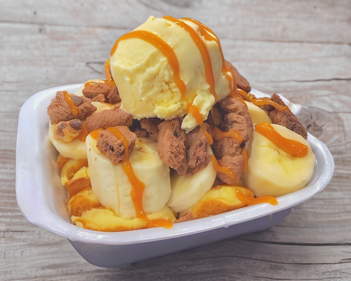 Duraznos en almíbar troceados con nuestra receta especial de crema y toppings a elegir.