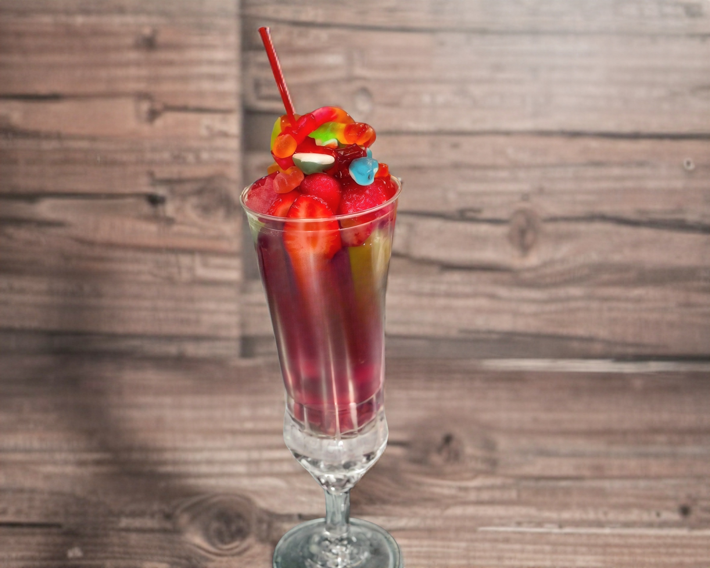 Fresas frescas picositas con chamoy, limón, chilito en polvo y gomitas a elegir.