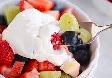 Yogurt griego, un toque de miel natural, fresa, durazno y manzana con granola y mermelada de fresa como decoración.