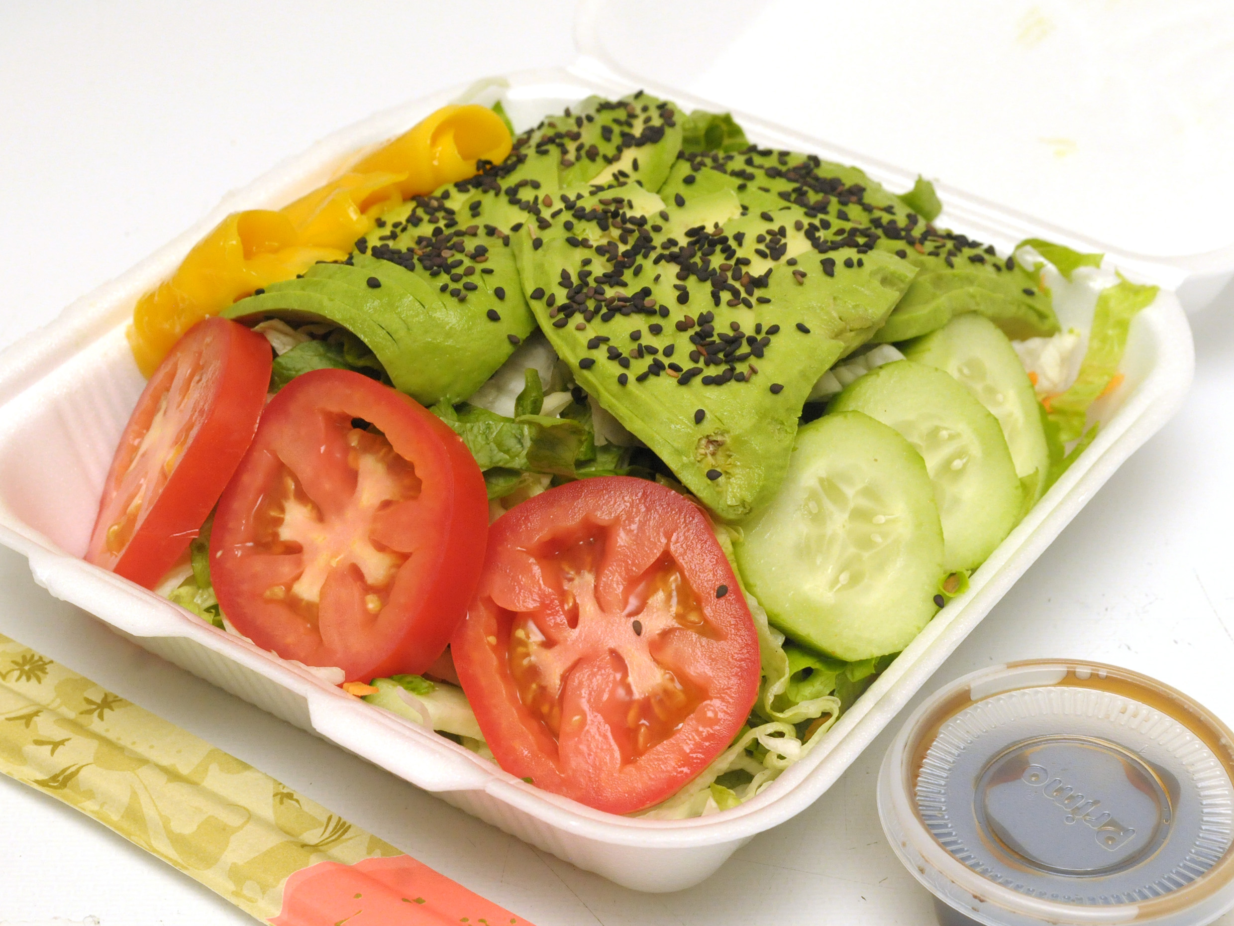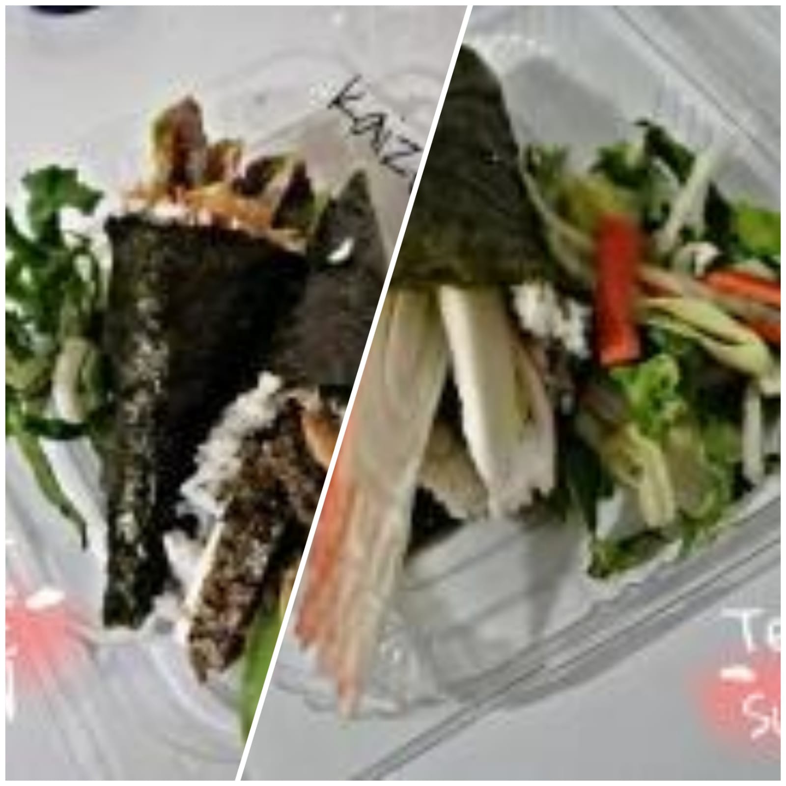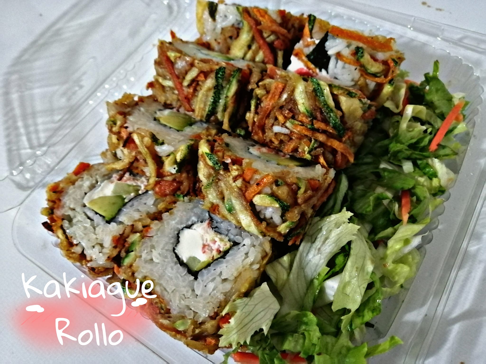 Pf: Alga, pd: Ensalada de lechuga, pepino, aguacate, zanahoria, brócoli, coliflor y queso Philadelphia.