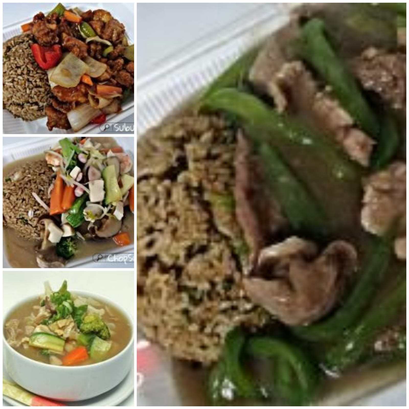 Verduras asadas acompañadas de arroz frito o al vapor, camarón, pollo, pescado y res.