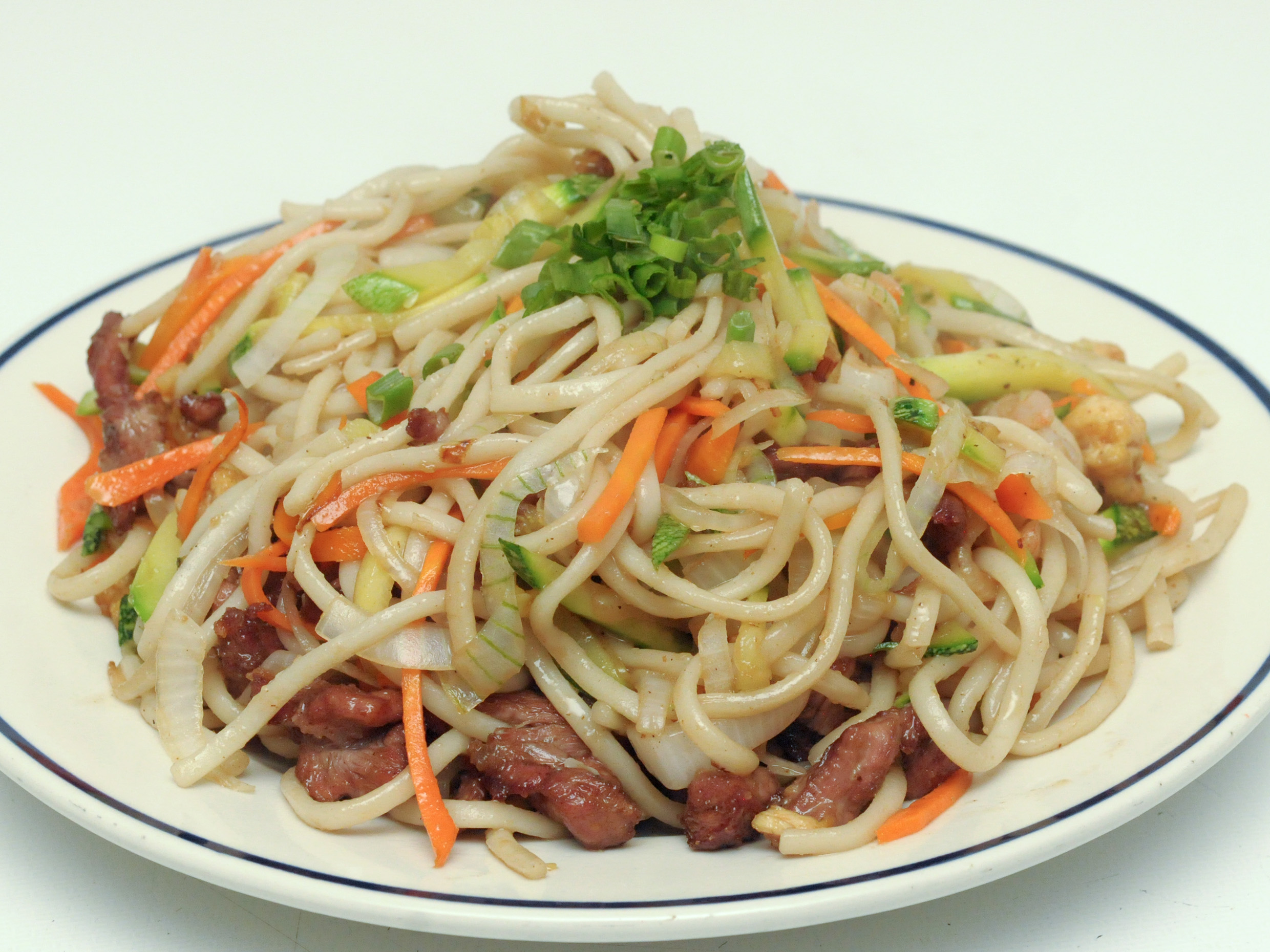 Fideos guisados con salsa de soya dulce, verdura rayada, pollo, res, camarón y cerdo.