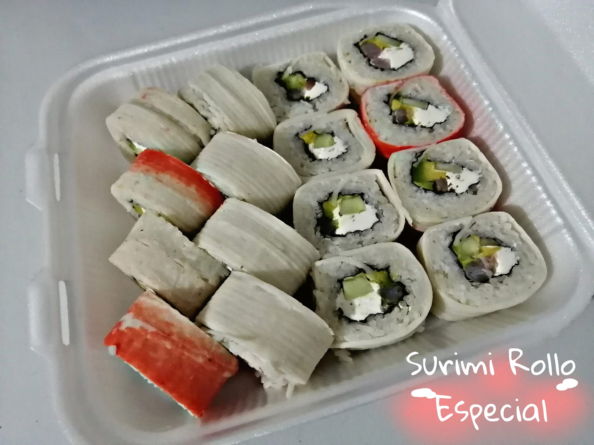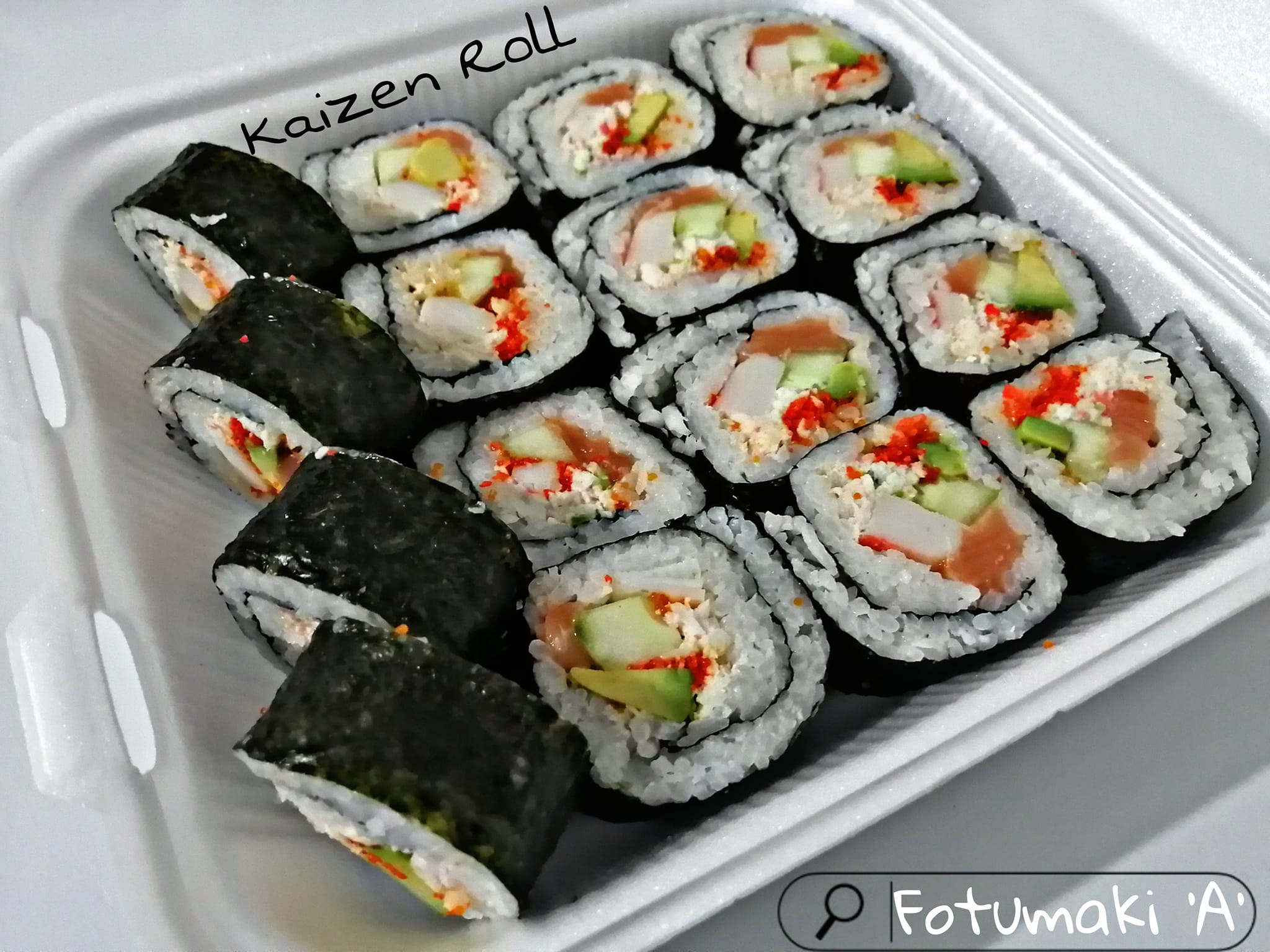 P.f: Alga, pd: Pepino, aguacate, camarón, masago, surimi, salmón y queso Philadelphia.
