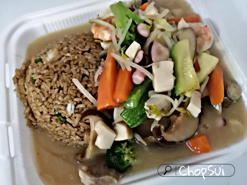 Mariscos con carne de cerdo y verduras con arroz frito o al vapor.