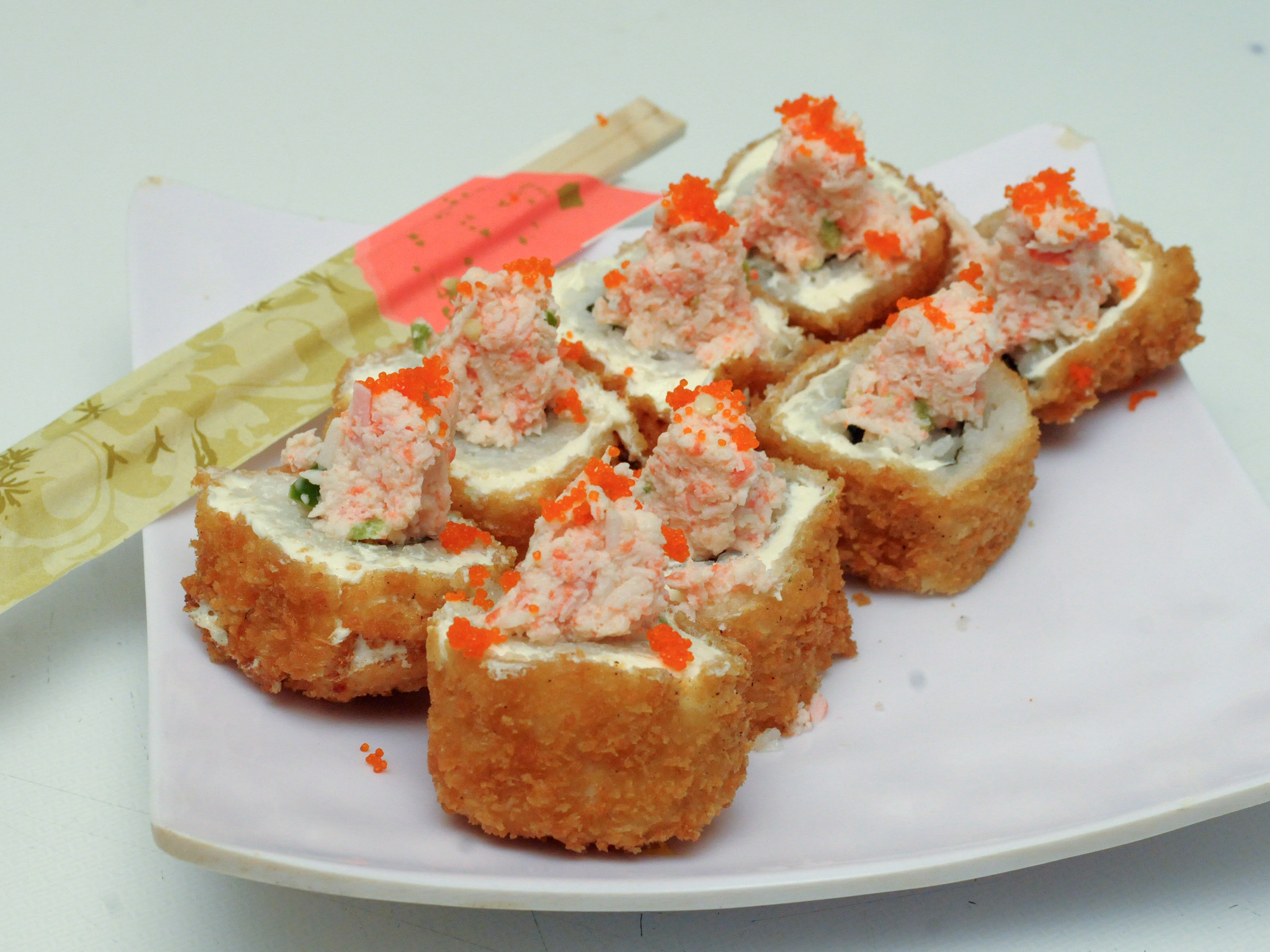 Pf: Masago, pd: Pasta de surimi, queso Philadelphia, pepino y aguacate.