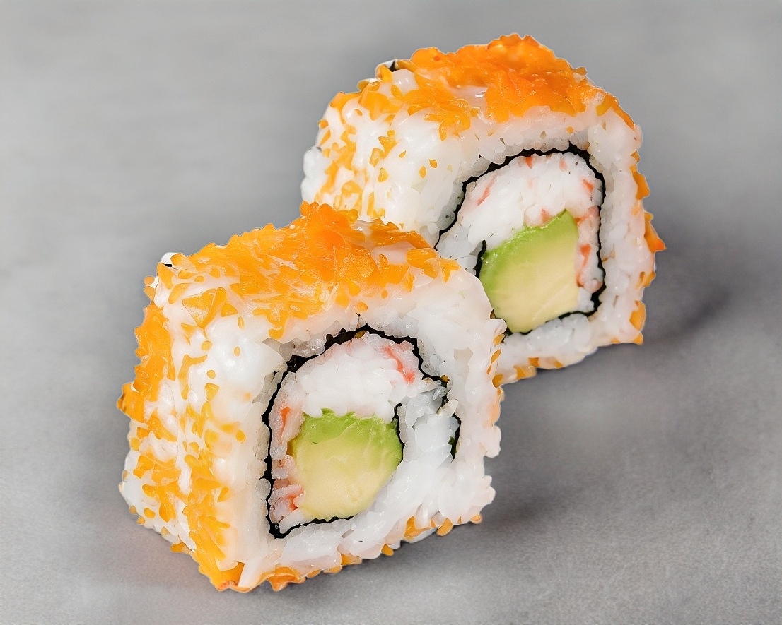 Con camarón, queso, pepino y aguacate, cubierto con masago
