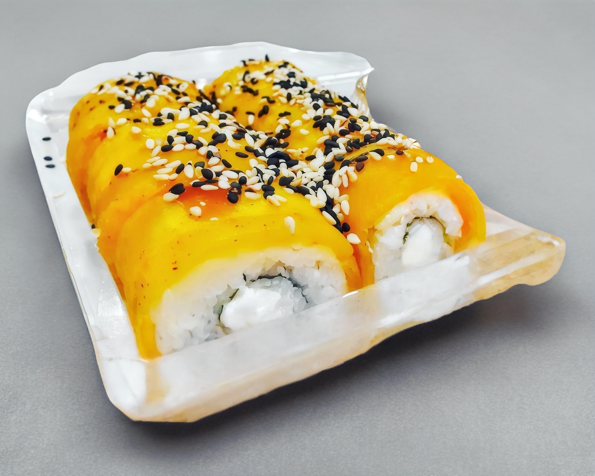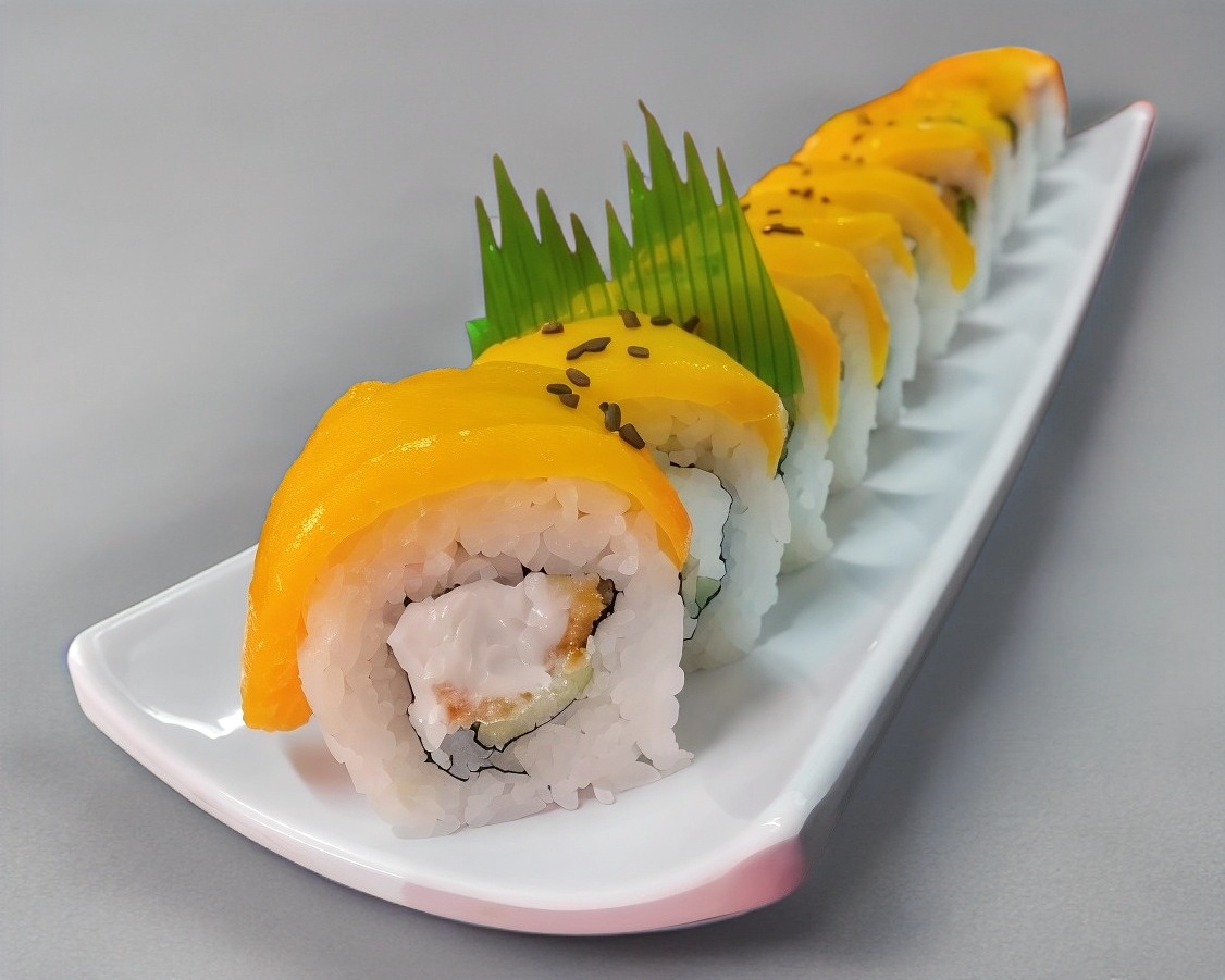 Con Camarón empanizado, queso, pepino y aguacate. Cubierto con delicioso mango.