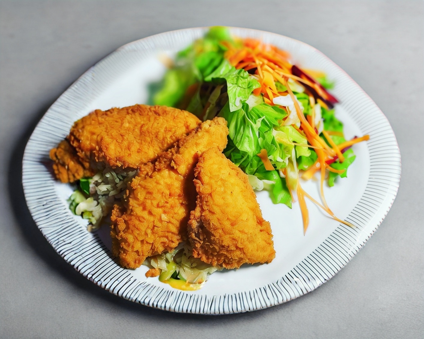 Riquisima milanesa de pollo empanizada con panko y servida con yakimeshi y ensalada.(porcin personal)