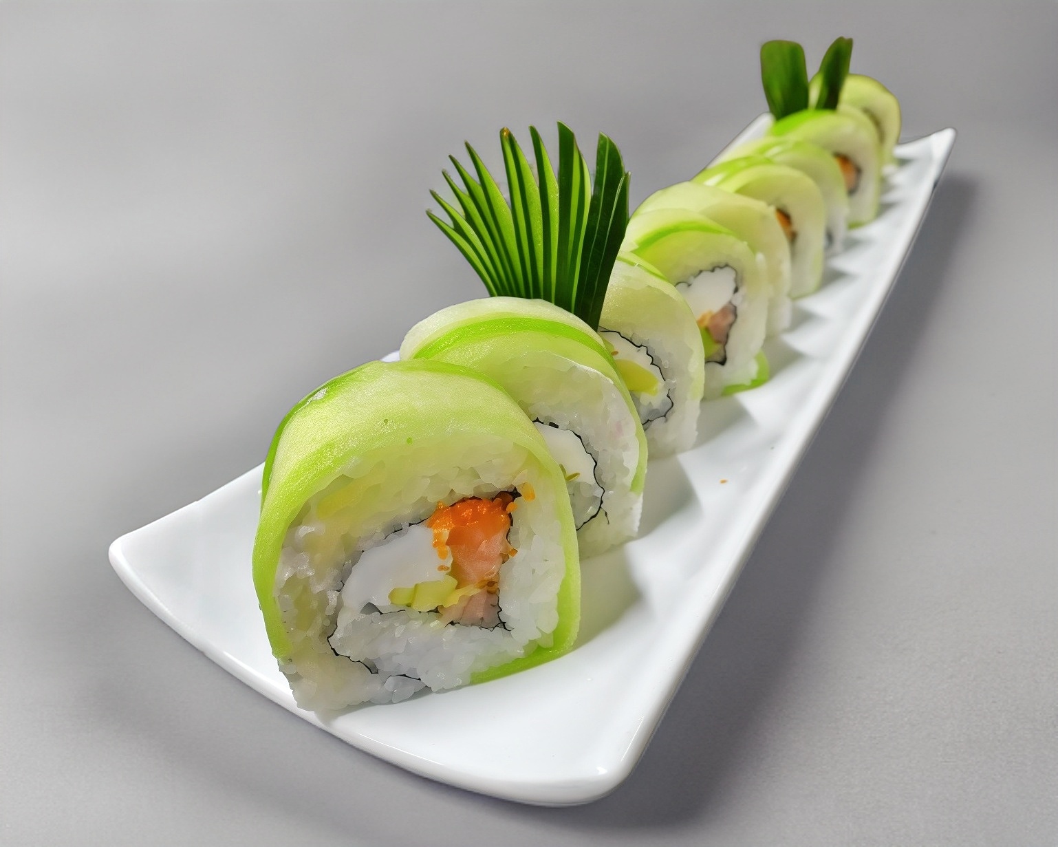Por dentro masago, queso, tampico y aguacate. Cubierto con pepino.