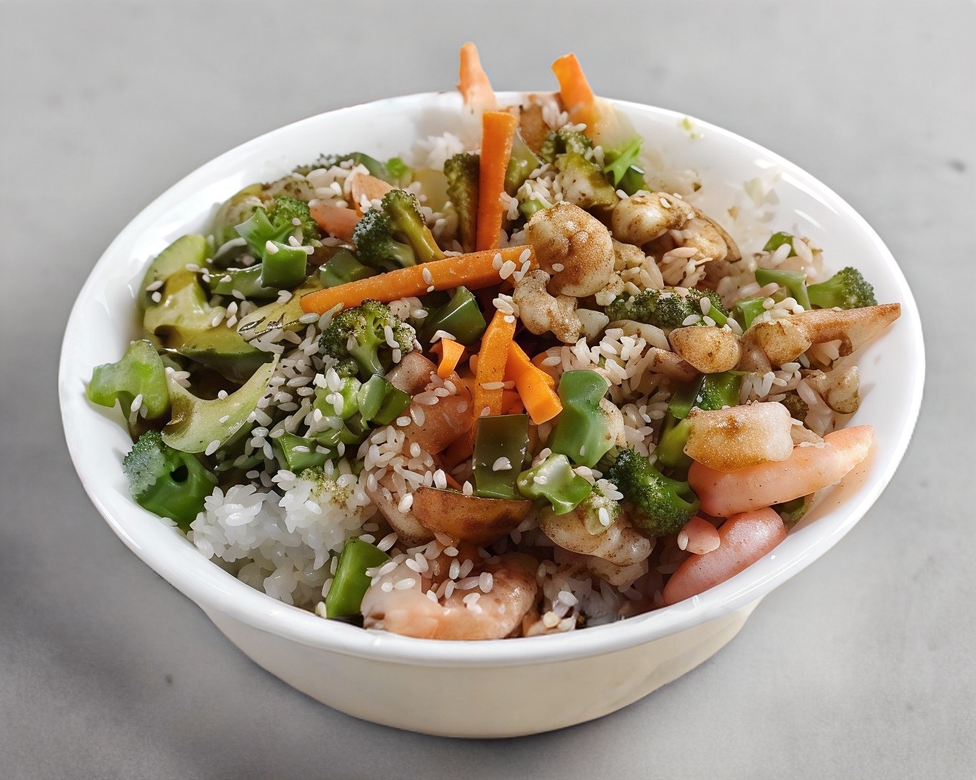 Delicioso arroz gohan acompañado de camarones empanizados, chiles y aguacate