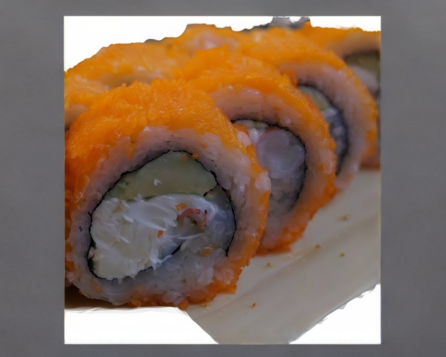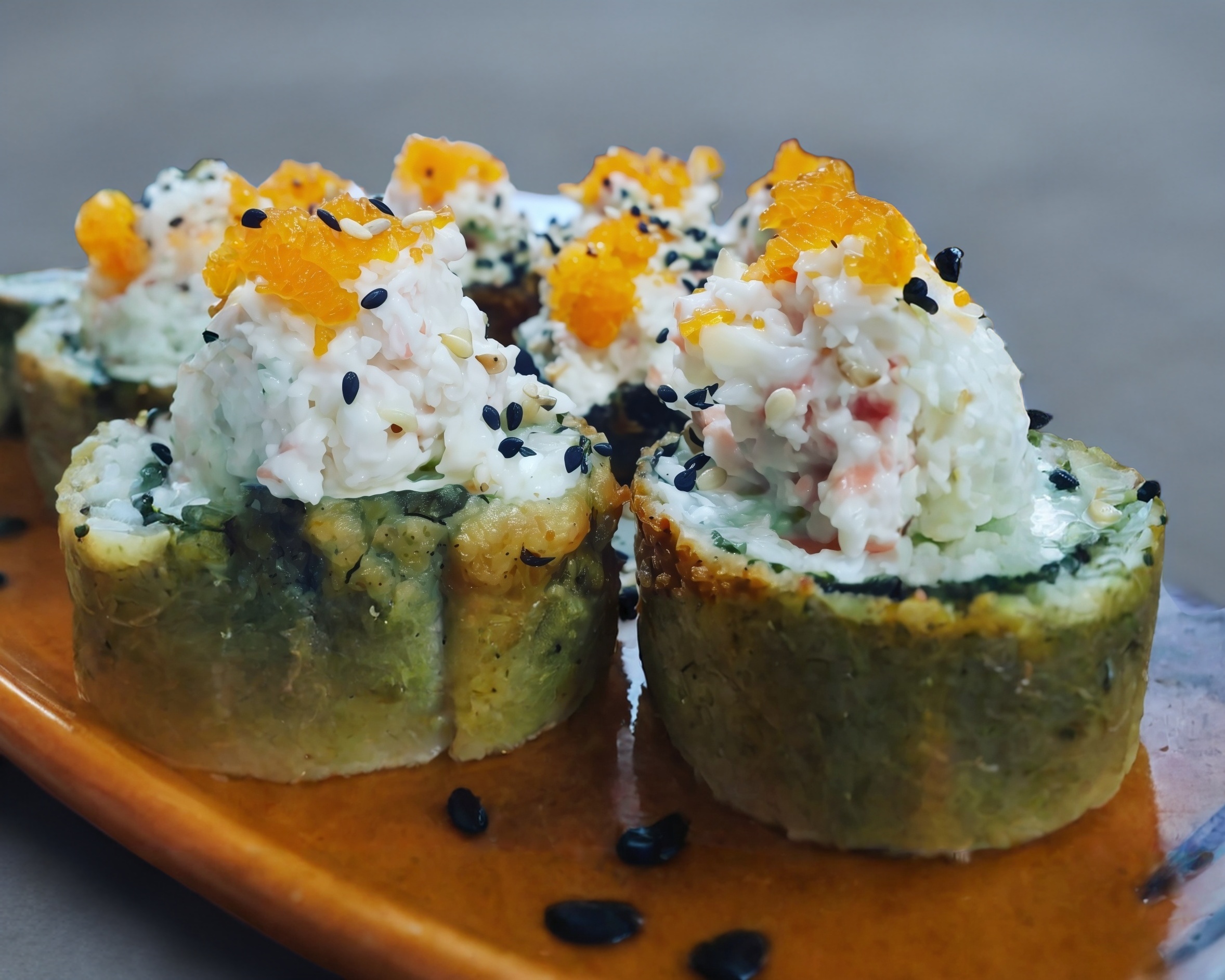 Con Tampico, queso, pepino y aguacate. Cubierto con masago.