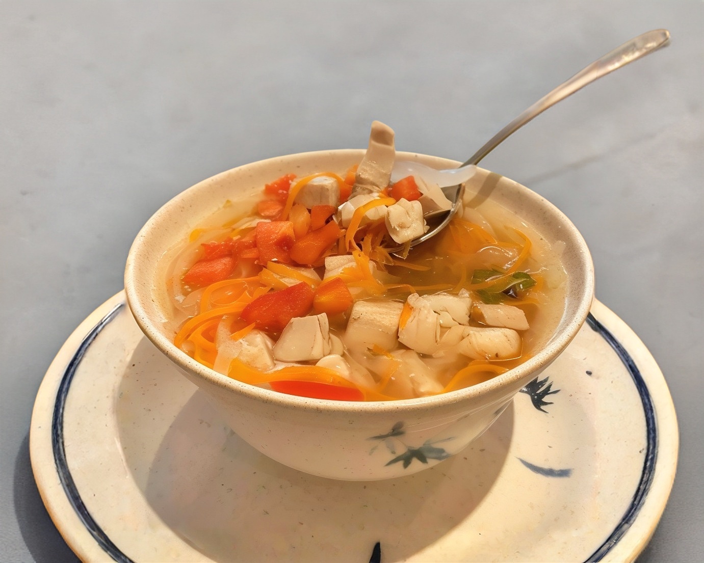 Eexquisita sopa de pescado con verduras rayadas.500ml