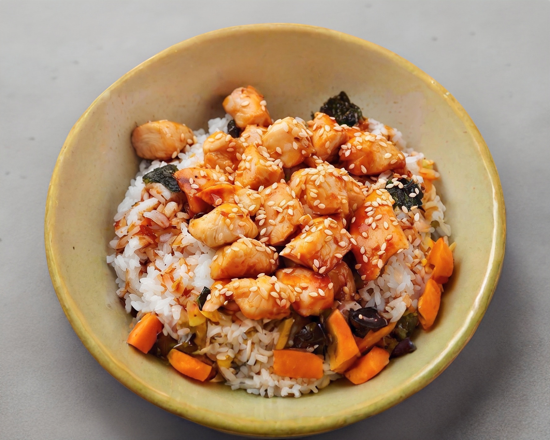 Pollo agridulce servido con arroz al vapor