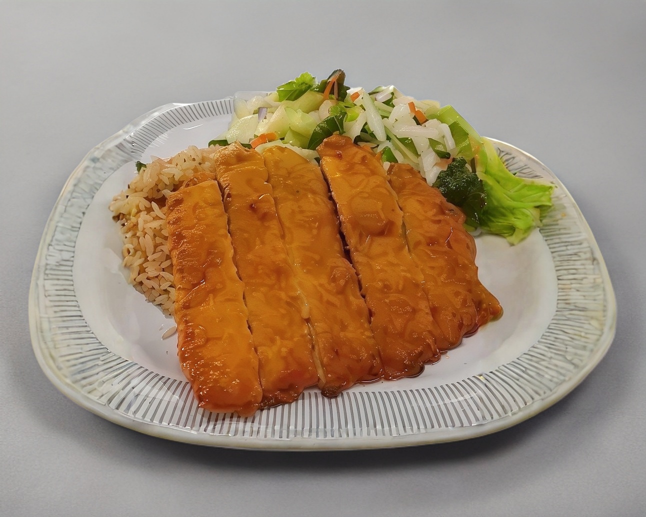 Exquisita pechuga empanizada (250gr), rellena con queso manchego o filadelfia y servida con yakimeshi y ensalada como : lechuga fresca italiana romana ,zanahoria y pepino (salsa soja)(Porción Personal)