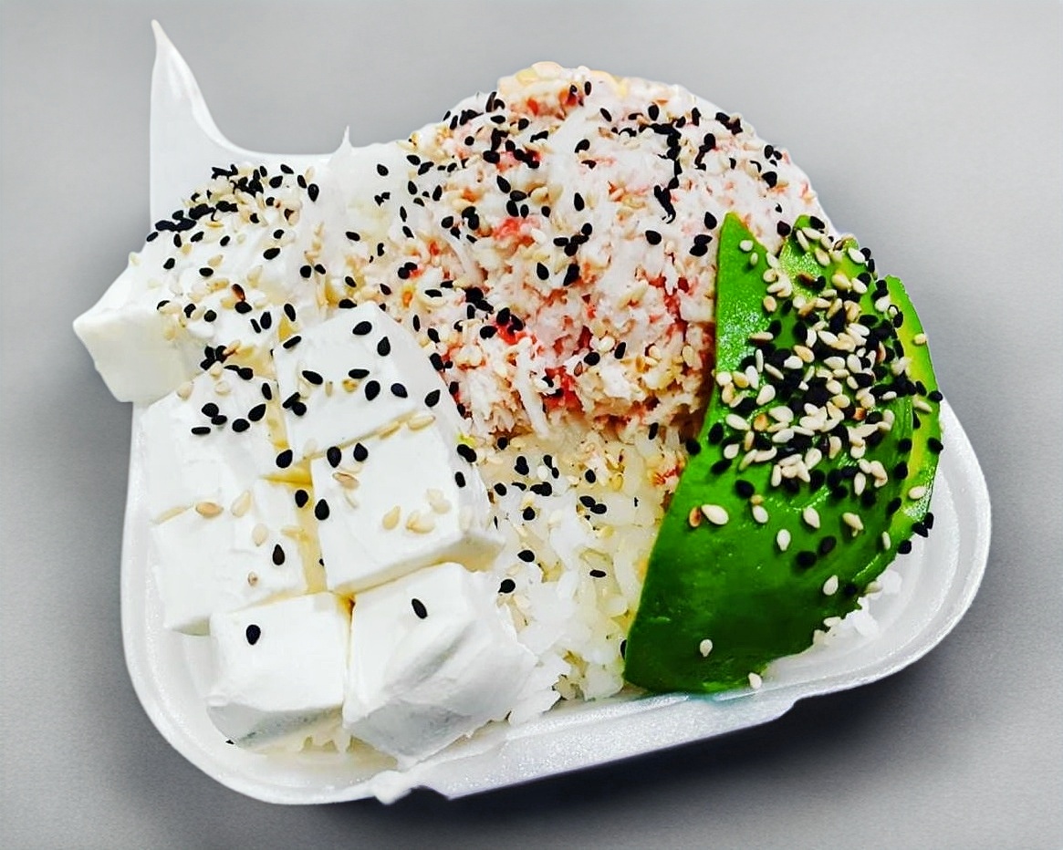 Arroz al vapor servido con tampico, queso y aguacate