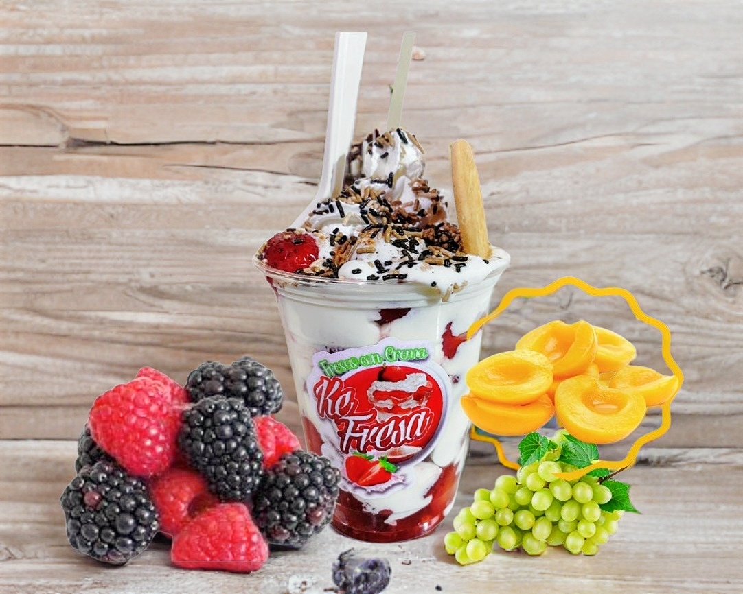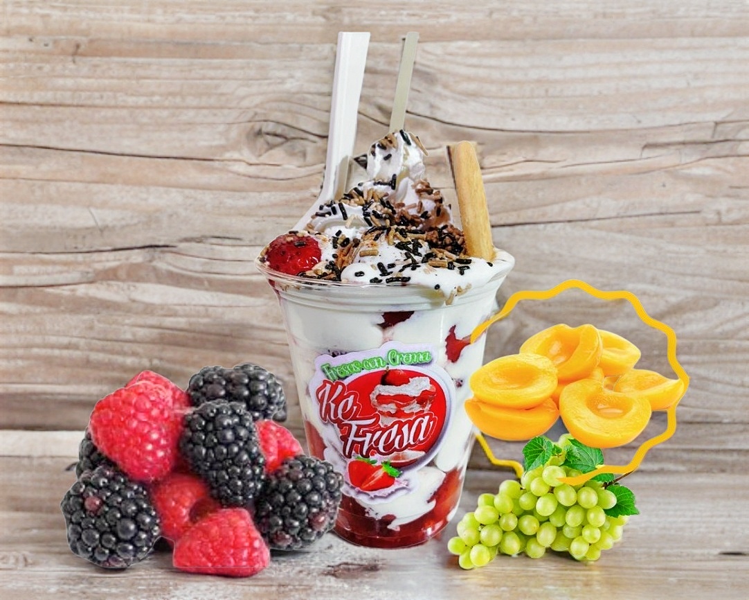 Combinación de 5 frutas zarzamora, frambuesa, fresa, uva verde y durazno con crema especial de la casa.