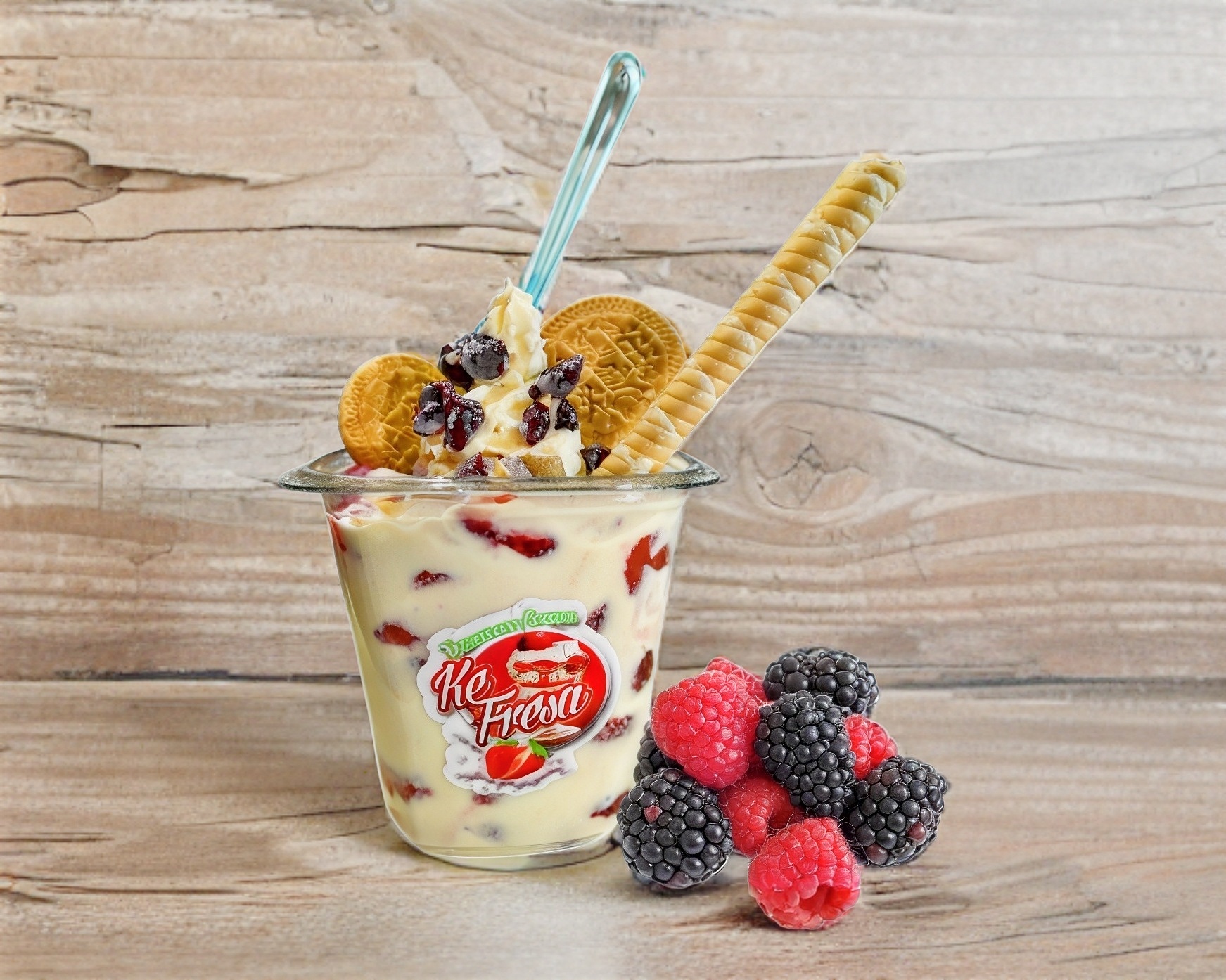 Frutos rojos, zarzamora, frambuesa, blueberry y fresa con crema especial de la casa.