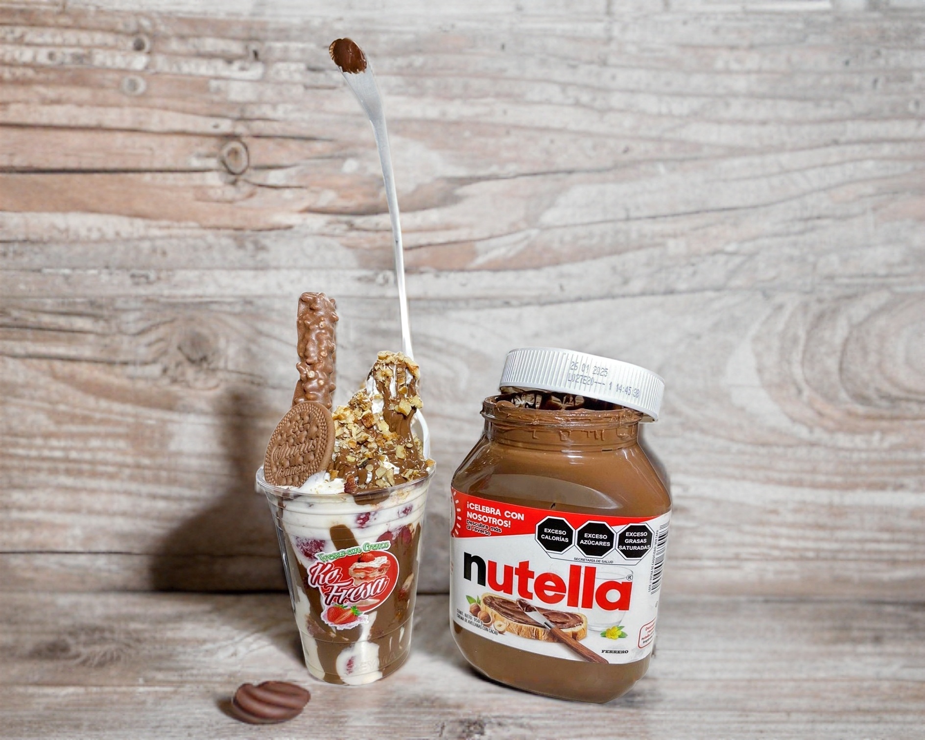 Fresas bañadas de Nutella de 1 L, con crema especial de la casa.