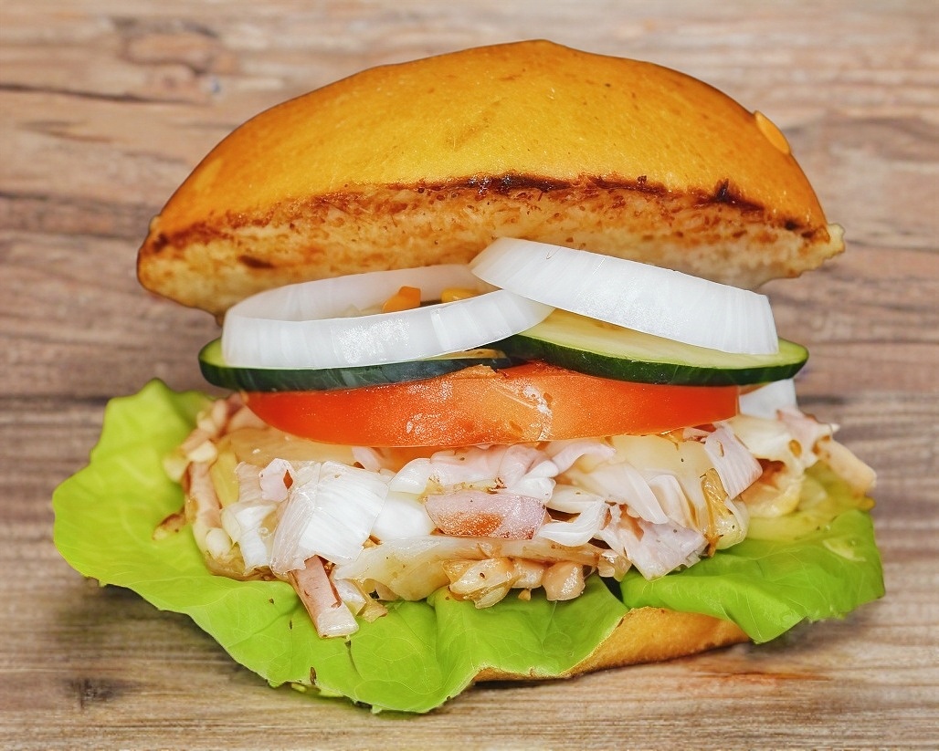 La carne de tu elección marinada en salsa especial kebab de la casa, lechuga, jitomate, cebolla, pepino y zanahoria sobre un bollo.