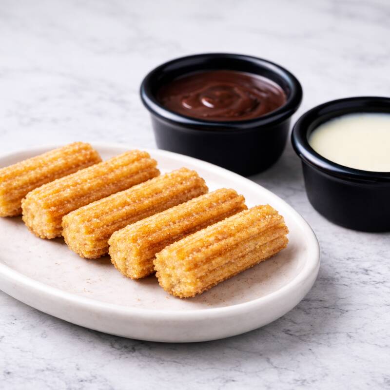 Orden de 5 churros deliciosos y crujientes, espolvoreados con azúcar y canela. Acompáñalos con chocolate o lechera.