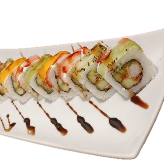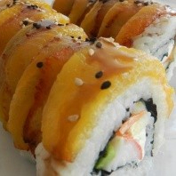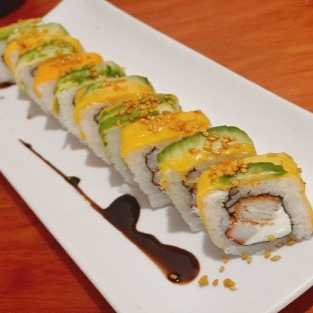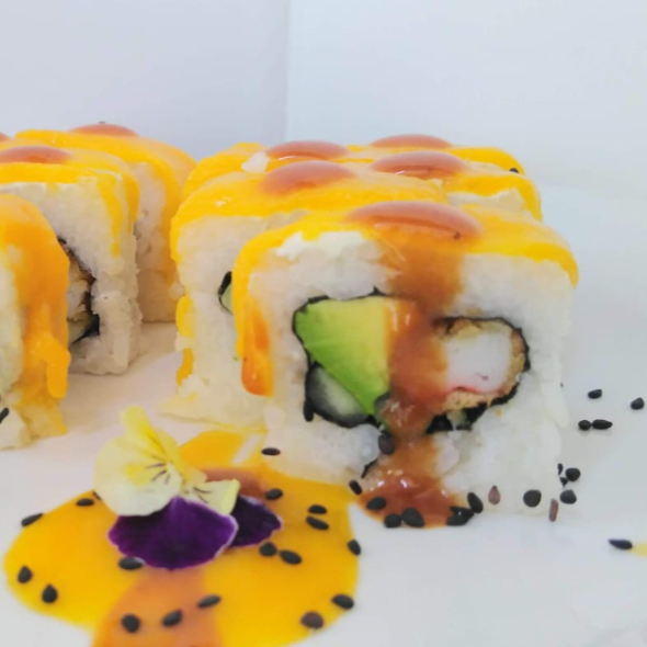 rollo especial Neptuno P.D: pescado crujiente, surimi y queso crema P.F: aguacate, mango y nuez caramelizada troceada