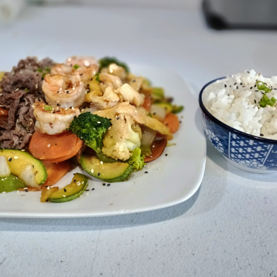 TEPANYAKI Verduras crocantes a la plancha, acompañadas de sopa miso o gohan y proteína a elegir Verduras: pimiento, cebolla, calabaza, brócoli, coliflor.