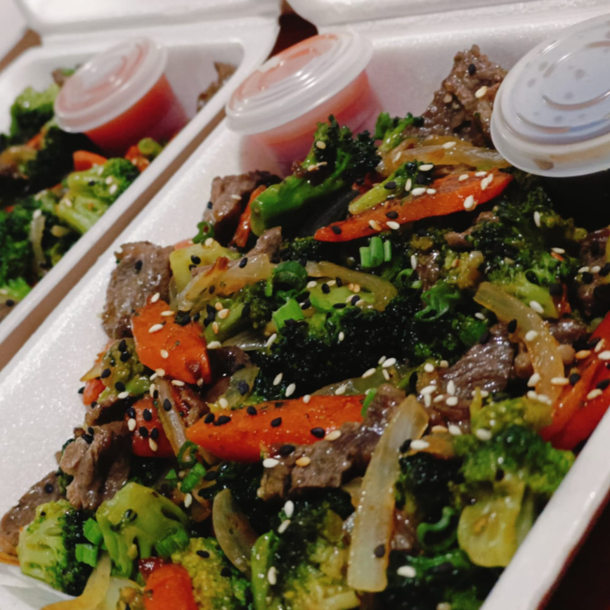 BROCOLI BEFF Brócoli salteado con la salsa de la casa, cebolla, zanahoria y res acompañado de arroz gohan