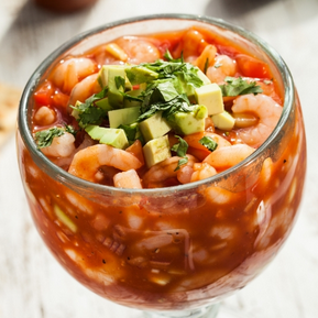 Coctel de camaron hecho con las salsa especial de la casa acompañado de agucate, cebolla,