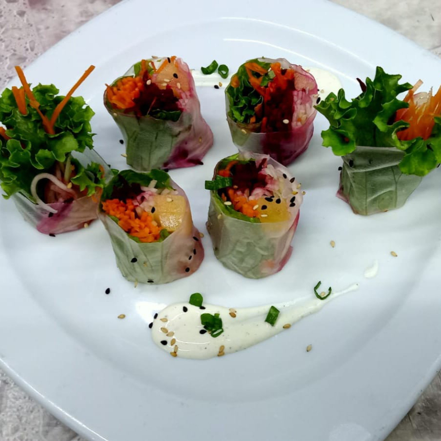 NEMS TRADICIONAL 3 pz Rollito fresco en papel de arroz con veduras y hierbas aromaticas, servidocon salsa de cacahuate y protenina de tu elecion.