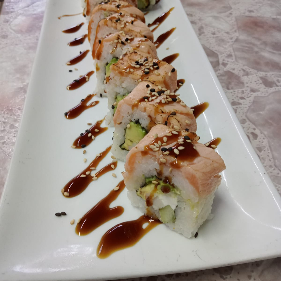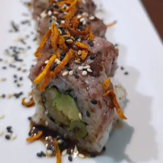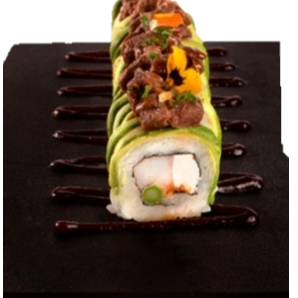DAMIAN ROLL P.F. Filete de res flameado P.D. Kushiague de queso, aguacate, cebollín