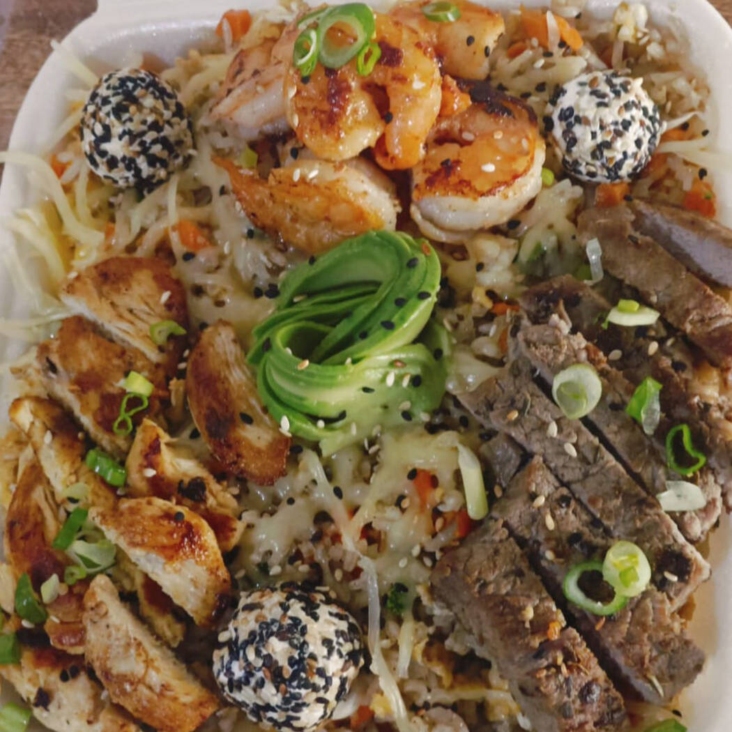 Arroz frito a la plancha con huevo, zanahoria, pimiento, calabaza, cebolla, tampico, queso manchego, aguacate y Rib eye