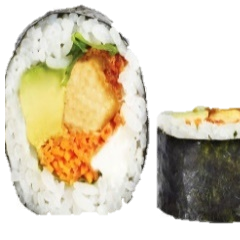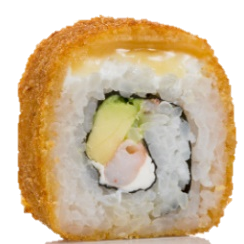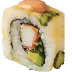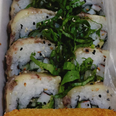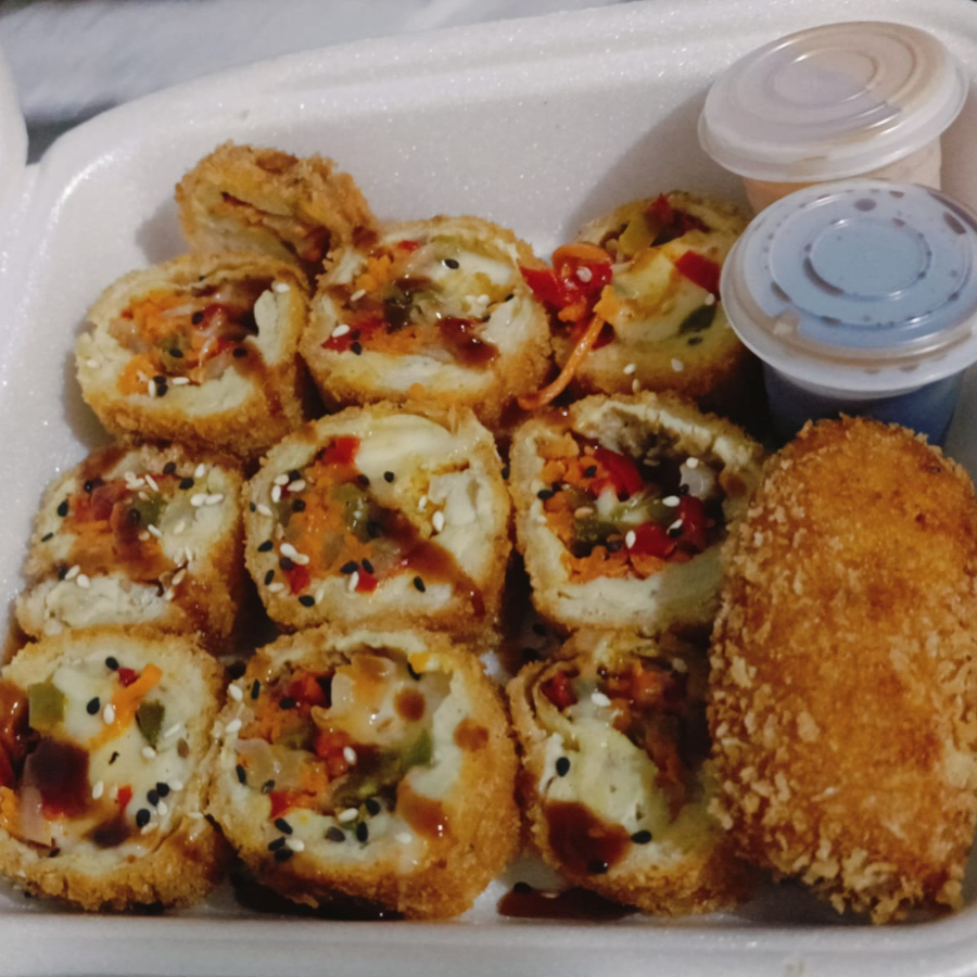 rollo de sushi P.F: empanizado P.D: queso crema, manchego, surimi, aguacate y pepino