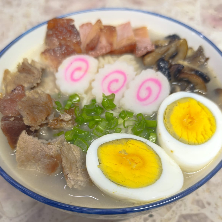RAMEN Fondo tradicional japones (cerdo y pollo) con fideos,huevo, panceta,hongos cebollin, granos de elote y proteína a elegir