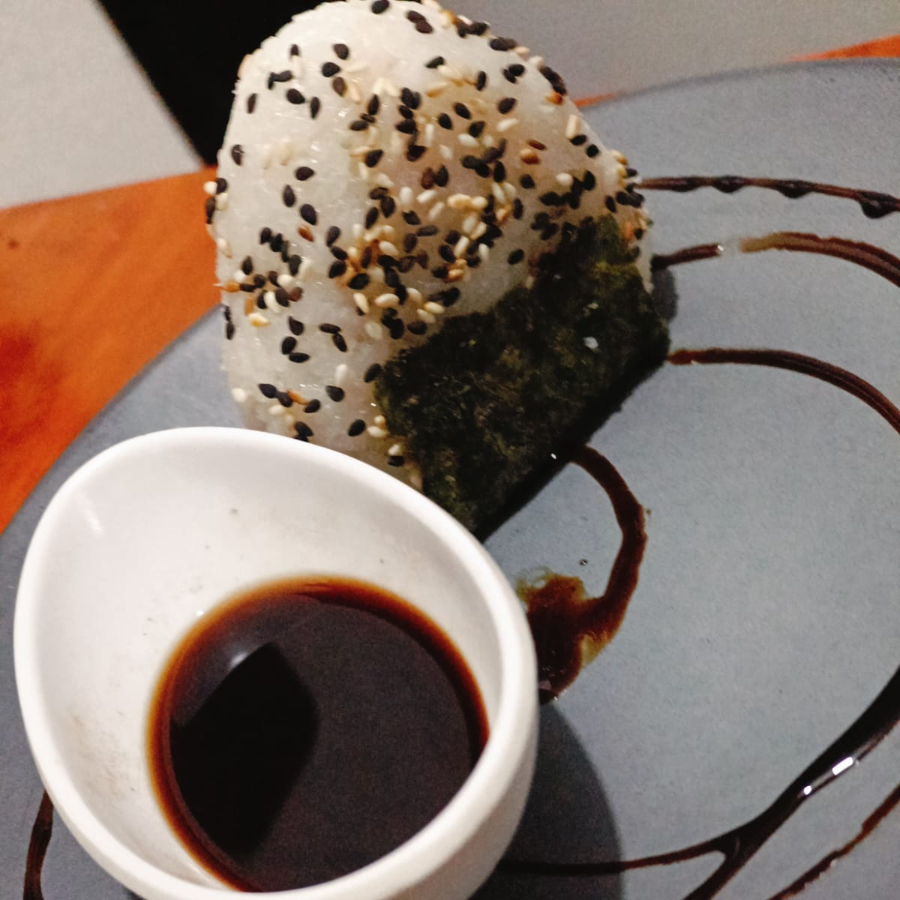 ONIGIRIS Omusubi, bola de arroz rellena de queso philadelphia, agucate, pepino y aderezo de la casa, proteína a elegir