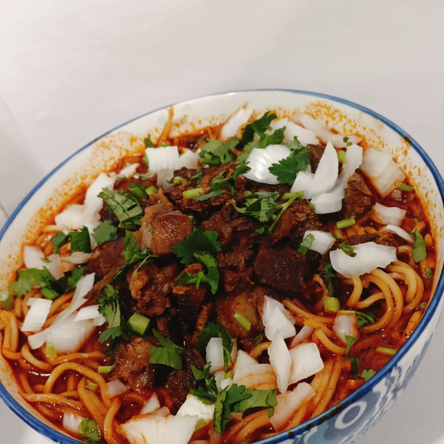 BIRRIAMEN Fondo de birria con fideos, carne de res, cebolla y cilantro -SABADOS Y DOMINGOS
