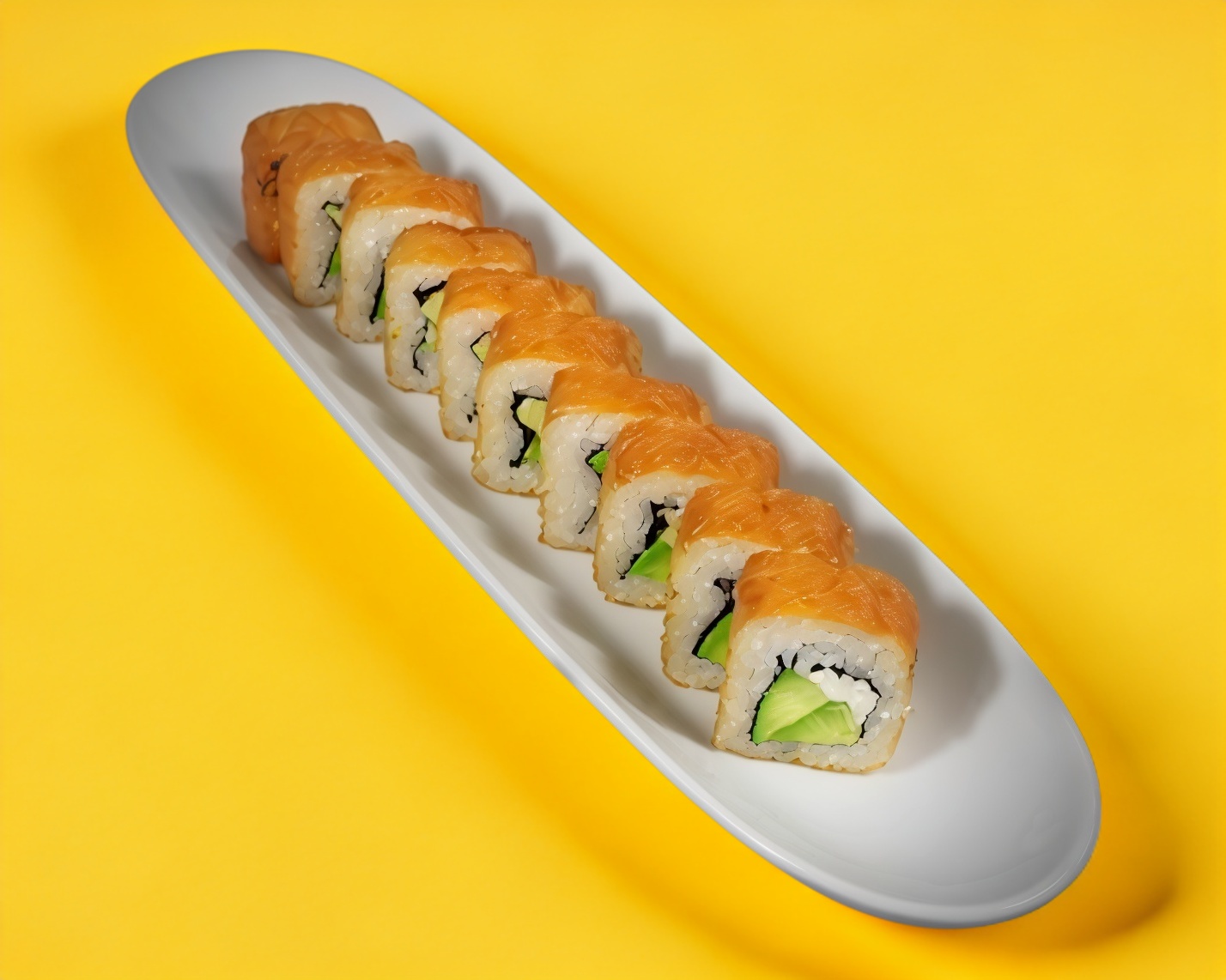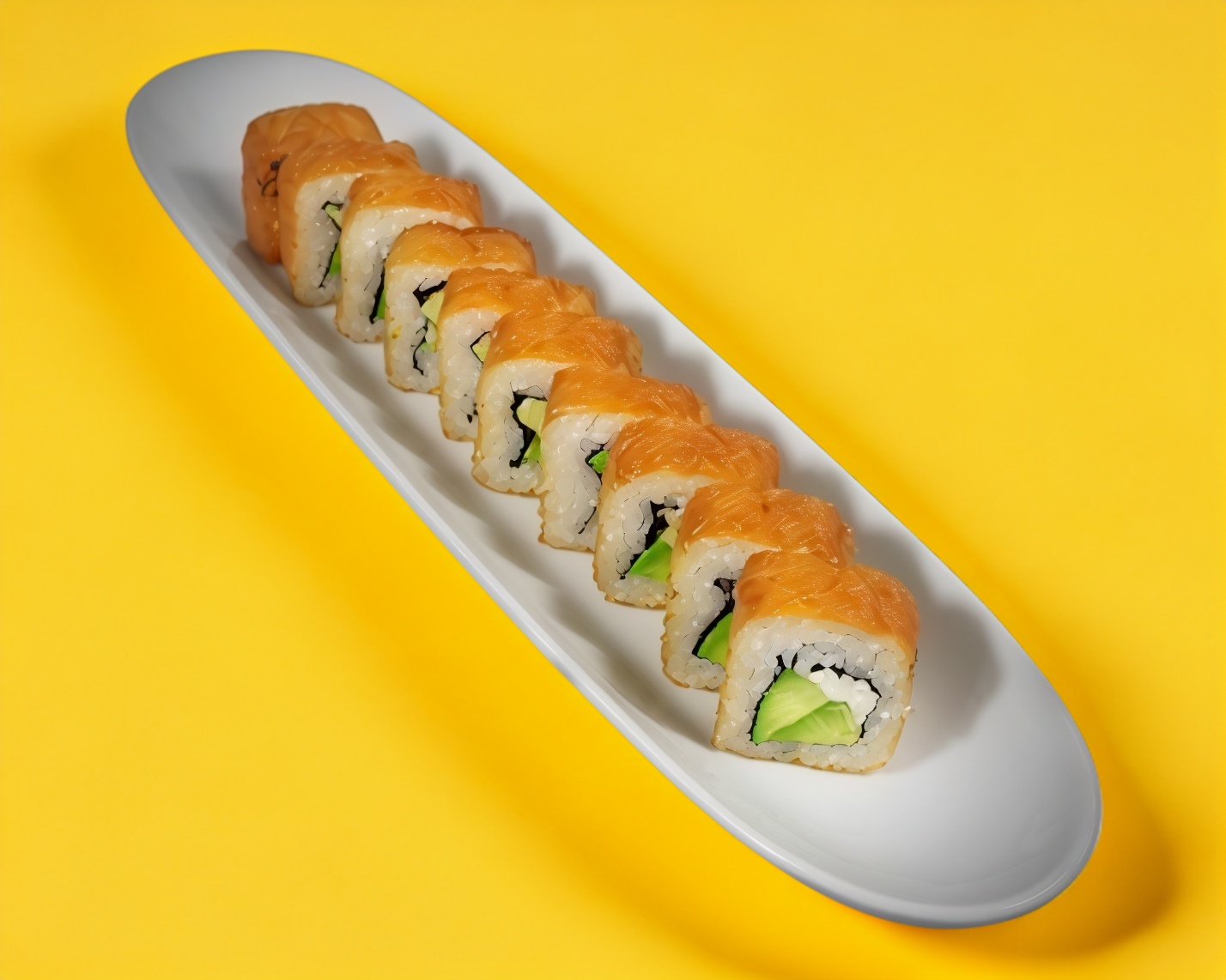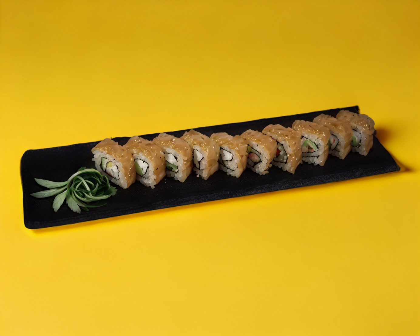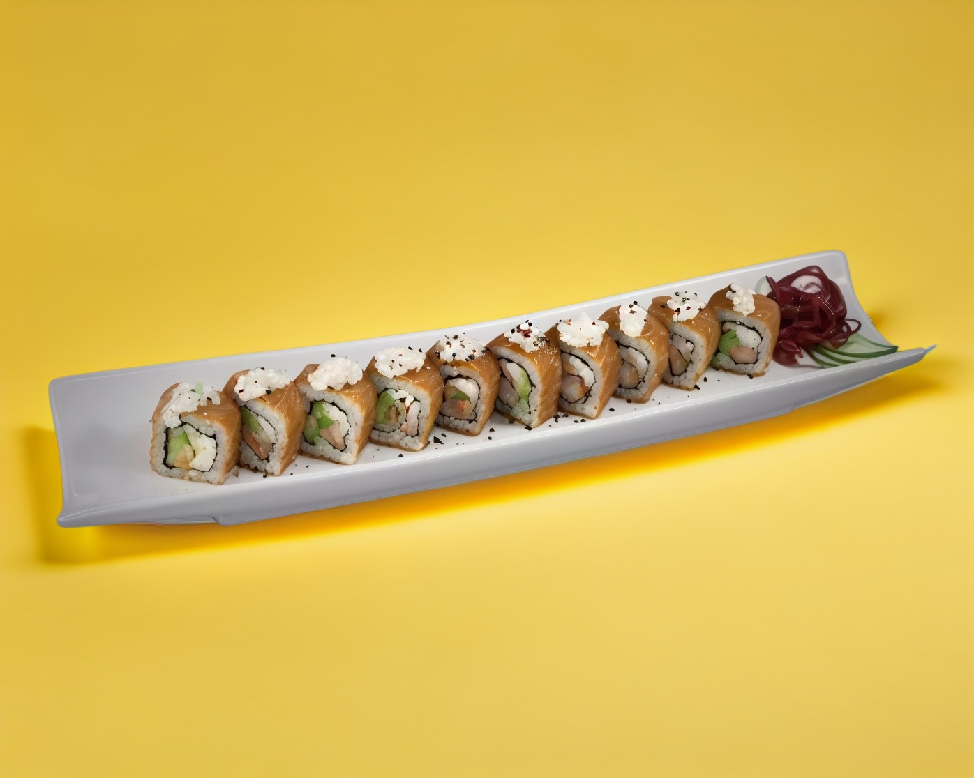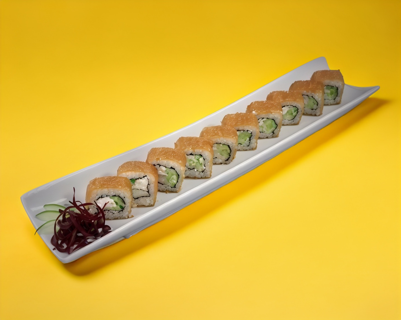 Por fuera Ajonjolí, Por dentro aguacate, Philadelphia, pepino y salmón.